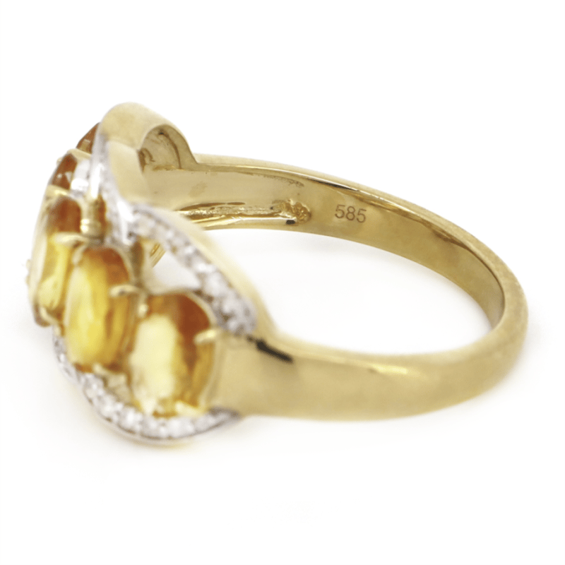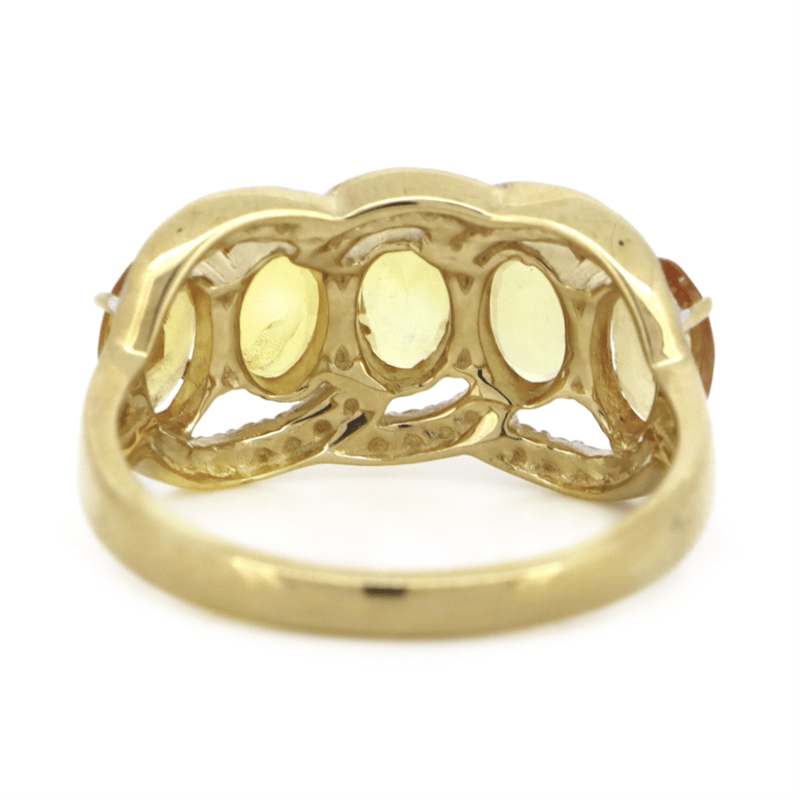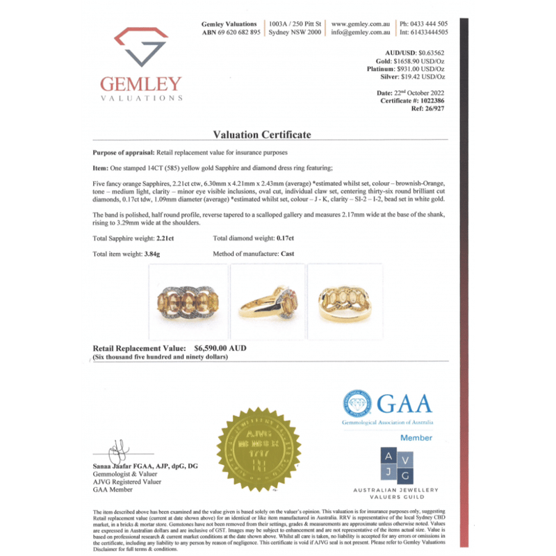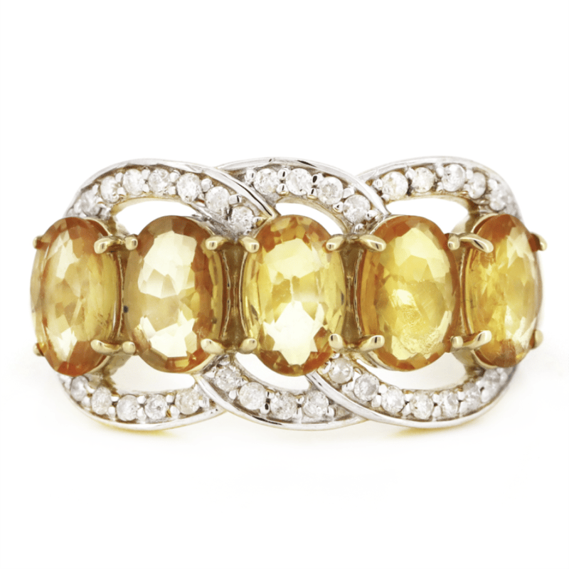 The Central Design Features, 5 Oval Cut, Medium-Light Brownish-Orange, Sapphires (2.21Ct Tsw, Minor Eye Visible Inclusions), Claw Set. Surrounding The Central Design Are, 36 Round Brilliant Cut, Diamonds (0.17Ct Tdw, J-K Colour, Si2-I2 Clarity), Bead Set In White Gold. Ring Size N.