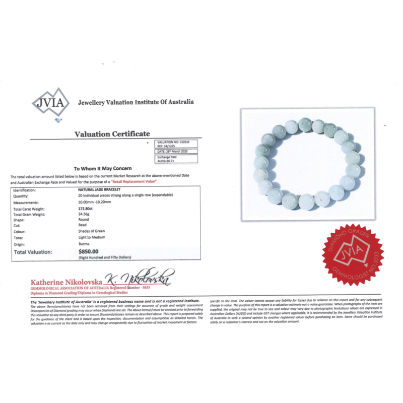 172.80CT TSW, BURMESE JADE BEAD, BRACELET. The Design Features, 20 Round, Light-Medium Shades Of Green, Burmese Jade Beads (10.00Mm-10.20Mm Size). Each Bead Is Individually Strung Along A Single Row (Expandable). Total Weight Is 34.56 Grams. Valuations Provided by an Independent Third-Party Professional Not Directly Associated With Lloyds Auctions at AUD $$850.00This valuation has been conducted by an independent third-party professional. The valuation amount is an assessment by the issuing valuer and does not reflect the auction value of the item. Any inquiries regarding the valuation should be directed to the issuing valuer (refer to contact details on the certificate), as Lloyds Auctions has no affiliation or influence over the valuation, the valuer, or the stated amount. Condition: Good - Refer Images 0645845+1535
