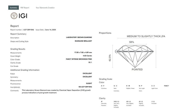4.02 CARATS FANCY INTENSE BROWNISH PINK/VS1 LAB GROWN DIAMOND - IGI CERTIFIED 4.02 Carats Fancy Intense Brownish Pink/Vs1 Lab Grown Diamond - Igi Certified Certificate Number - Lg713591846 Color/Clarity - Fancy Intense Brownish Pink/Vs1 Shape - Marquise Dimension - 17.55 X 7.82 X 4.89 Mm Cut - N/A Symmetry - Excellent Fluorescence - Slight Polish - Excellent External Video Link - Https://Kn360.S3.Eu-North-1.Amazonaws.Com/713591846.Html 0 +225
