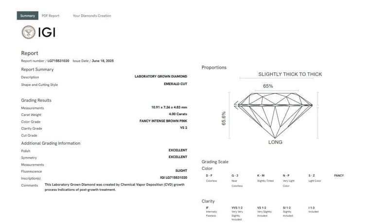 4.00 CARATS FANCY INTENSE BROWN PINK/VS2 LAB GROWN DIAMOND - IGI CERTIFIED 4.00 Carats Fancy Intense Brown Pink/Vs2 Lab Grown Diamond - Igi Certified Certificate Number - Lg715531020 Color/Clarity - Fancy Intense Brown Pink/Vs2 Shape - Emerald Dimension - 10.91 X 7.36 X 4.83 Mm Cut - N/A Symmetry - Excellent Fluorescence - Slight Polish - Excellent External Video Link - Https://Kn360.S3.Eu-North-1.Amazonaws.Com/715531020.Html 0 +227