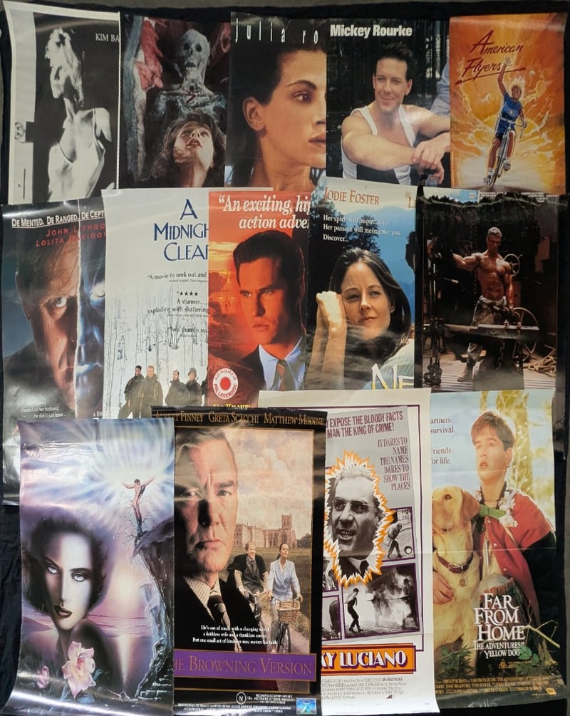 COLLECTION OF POSTERS Posters Include : 'Lucky Luciano', 'The Browning Version', 'Far From Home', 'Nell', 'Thunderheart', 'Raising Cain', 'The Hensel Collection', 'A Midnight Clear', ' Sleeping With The Enemy', 'American Flyers', Mickey Rourke, Kim Basinger, 'Time Cop' Item Lengths Range From Approx: 70Cm -100Cm Some Posters Have Tears And Wear 584886+5