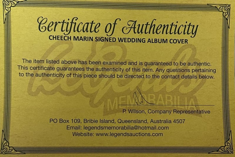 CHEECH MARIN SIGNED WEDDING ALBUM COVER Cheech Marin Personally Signed Wedding Album. Richard "Cheech" Marin Is An American Comedian And Actor. Marin Gained Recognition As Part Of The Comedy Act Cheech & Chong With Tommy Chong During The 1970S And Early 1980S. The Item Is Accompanied By A Certificate Of Authenticity.Condition: Good - Refer To Images584906+32