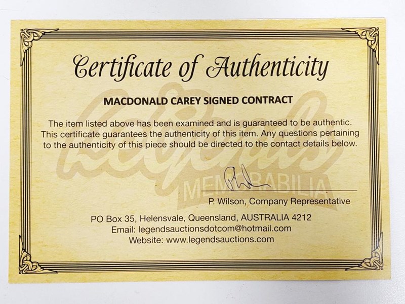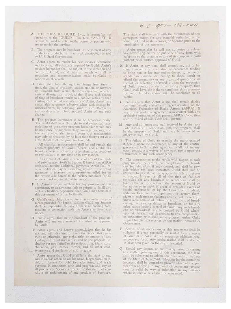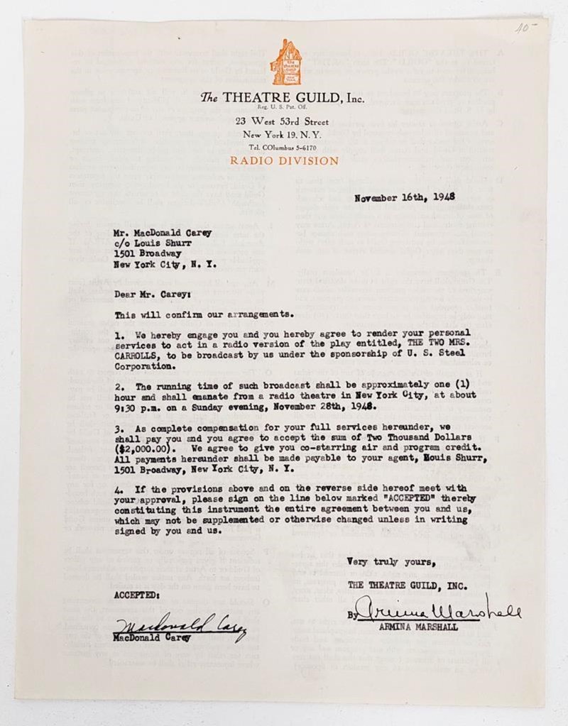 MACDONALD CAREY HANDSIGNED "THE THEATRE GUILD" CONTRACT Comes With Certificate Of Authenticity Size: Condition: Excellent - Refer To Images 155566+93