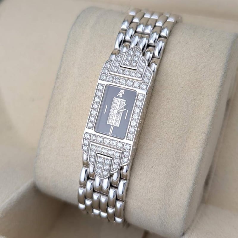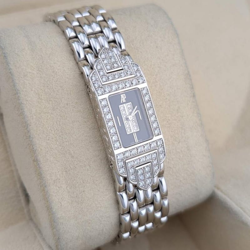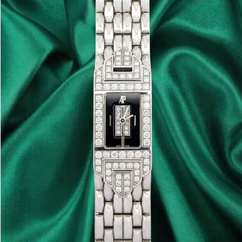 AUDEMARS PIGUET 67029BC CHARLESTON WHITE GOLD DIAMOND ONYX DIAL 15MM ~2000S Price Guide - Circa $27,000 Brand: Audemars Piguet Reference: 67029Bc Model: Charleston In 18K White Gold, Diamond Bezel, Black Onyx Dial With Diamonds Case Size: 15Mm Circa: ~2000S Movement: Quartz Condition: Very Good; 100G Box: Yes Papers: No Condition: Good - Refer Images 0 488298+11