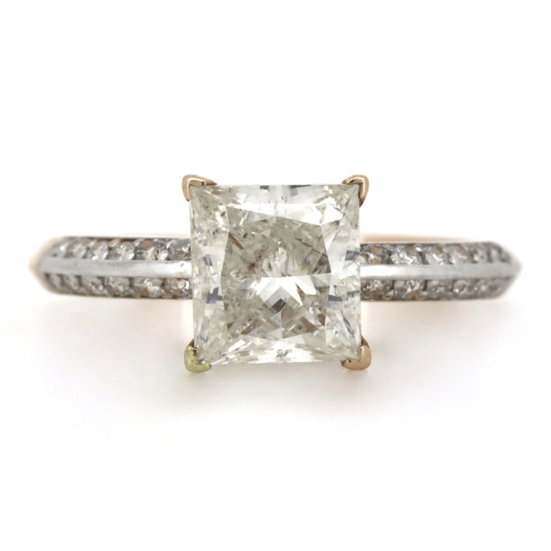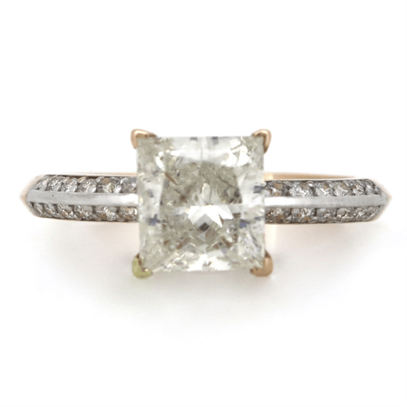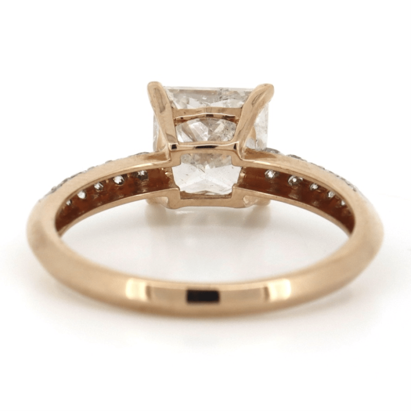 14K ROSE GOLD AND DIAMOND, CLASSIC RING. The Centre Features, One Princess Cut, Diamond (2.15Ct, K-L Colour, P1 Clarity), 4 Claw Set. Decorating The Band Are, 24 Round Brilliant Cut, Diamonds (0.12Ct Tdw, J-K Colour, Si1-P1 Clarity), Bead Set. Ring Size M. Valuations Provided by an Independent Third-Party Professional Not Directly Associated With Lloyds Auctions at AUD $$82,710.00 This valuation has been conducted by an independent third-party professional. The valuation amount is an assessment by the issuing valuer and does not reflect the auction value of the item. Any inquiries regarding the valuation should be directed to the issuing valuer (refer to contact details on the certificate), as Lloyds Auctions has no affiliation or influence over the valuation, the valuer, or the stated amount. Condition: Good - Refer Images 0 645848+3239