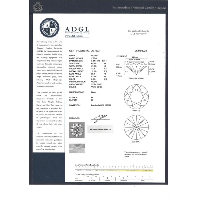 2.00CT CERTIFIED, NATURAL DIAMOND. Round Brilliant Cut, H Colour, I2 Clarity, Loose, Unset, Stone Comes With Adgl Report: A37693. Valuations Provided by an Independent Third-Party Professional Not Directly Associated With Lloyds Auctions at AUD $$20,000.00 This valuation has been conducted by an independent third-party professional. The valuation amount is an assessment by the issuing valuer and does not reflect the auction value of the item. Any inquiries regarding the valuation should be directed to the issuing valuer (refer to contact details on the certificate), as Lloyds Auctions has no affiliation or influence over the valuation, the valuer, or the stated amount. Condition: Good - Refer Images 0 645848+3229