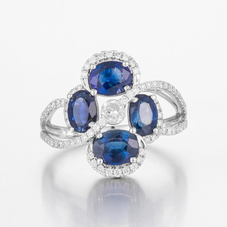 14CT WHITE GOLD AUSTRALIAN SAPPHIRE AND DIAMOND STATEMENT RING FEATURING CENTRE, 4 OVAL MIXED CUT, DEEP ROYAL BLUE AUSTRALIAN SAPPHIRES (2.85CT TSW, HEAVILY INCLUDED), CLAW SET, WITH 75 ROUND BRILLIANT CUT DIAMONDS (0.53CT TDW, F-G COLOUR, VS1-VS2 CLARITY), BEAD SET. RING SIZE O. Valuations Provided by an Independent Third-Party Professional Not Directly Associated With Lloyds Auctions at AUD $18000This valuation has been conducted by an independent third-party professional. The valuation amount is an assessment by the issuing valuer and does not reflect the auction value of the item. Any inquiries regarding the valuation should be directed to the issuing valuer (refer to contact details on the certificate), as Lloyds Auctions has no affiliation or influence over the valuation, the valuer, or the stated amount. Condition: Good - Refer Images 0+479