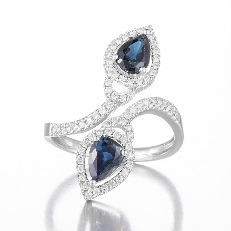 14CT WHITE GOLD AUSTRALIAN SAPPHIRE AND DIAMOND SPIRAL RING FEATURING CENTRE, 2 PEAR CUT, MODERATE DEEP ROYAL BLUE AUSTRALIAN SAPPHIRES (1.76CT TSW, MODERATELY INCLUDED), CLAW SET, WITH 70 ROUND BRILLIANT CUT DIAMONDS (0.35CT TDW, G-H COLOUR, VS1-VS2 CLARITY), PIP CLAW SET. RING SIZE O.