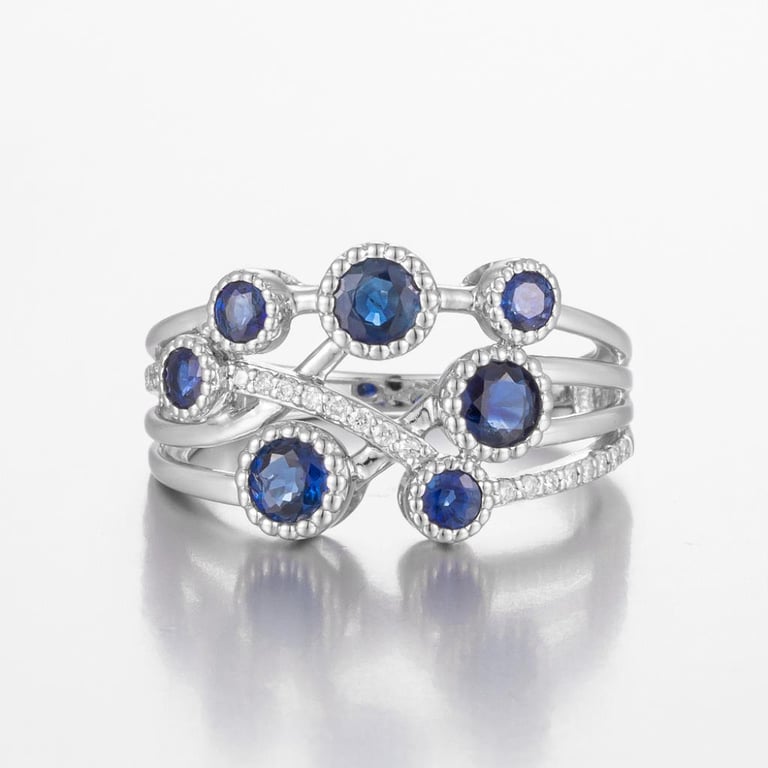 14CT WHITE GOLD AUSTRALIAN SAPPHIRE AND DIAMOND CLUSTER RING FEATURING CENTRE, 7 ROUND CUT, DEEP MODERATE ROYAL BLUE AUSTRALIAN SAPPHIRES (1.21CT TSW, MODERATELY INLCUDED), BEZEL SET, WITH 22 ROUND BRILLIANT CUT DIAMONDS (0.10CT TDW, G-H COLOUR, VS1-VS2 CLARITY), BEAD SET. RING SIZE O.