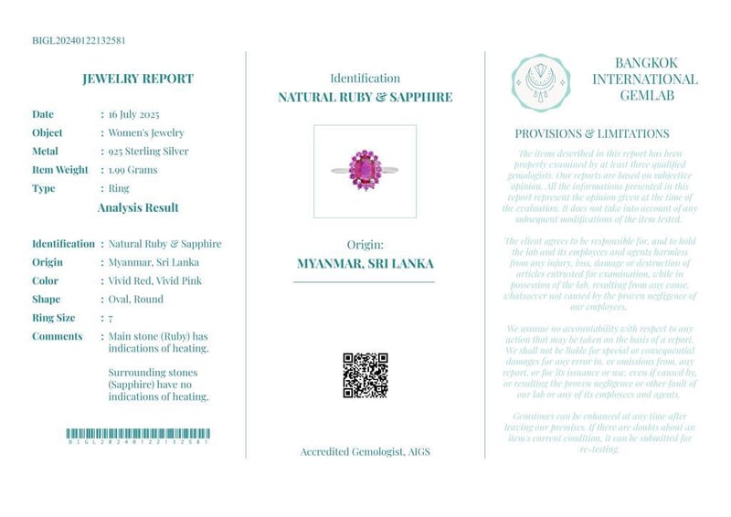 NATURAL BURMESE RUBY & SRI LANKAN SAPPHIRE (UNTREATED) RING ON 925 SILVER - WITH DIGITAL CERTIFICATE ONLY Gemstone : Natural Burmese Ruby & Sri Lankan Sapphire (Untreated)Certificate (Digital): Bigl20240122132581Item Total Weight : 1.99 GramsMain Stone Color : Vivid Red, Vivid PinkSize : 7Comments : Main Stone (Ruby) Has Indications Of Heating.Surrounding Stones (Sapphire) Have No Indications Of Heating.✻ Verify Report Online At Www.Bangkokinternationalgemlab.Co Condition: Good - Refer Images 01611137+8
