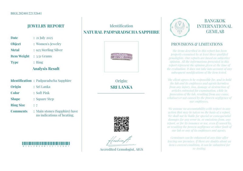 NATURAL PADPARADSCHA SAPPHIRE (UNHEATED) RING ON 925 SILVER - WITH DIGITAL CERTIFICATE ONLY Gemstone : Natural Padparadscha Sapphire (Unheated)Certificate (Digital): Bigl20240122132641Item Total Weight : 3.51 GramsMain Stone Color : Soft PinkSize : 7Comments : Main Stones (Sapphire) Have No Indications Of Heating.✻ Verify Report Online At Www.Bangkokinternationalgemlab.Co Condition: Good - Refer Images 01611137+12