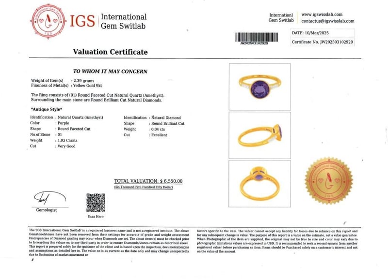 9CT YELLOW GOLD AMETHYST AND DIAMOND RING Ring Yellow Gold 9K Natural Amethyst : 1.93 Carat Natural Diamond : 0.04 Carat Item Weight : 2.39 G Valuations Provided by an Independent Third-Party Professional Not Directly Associated With Lloyds Auctions at AUD $6550This valuation has been conducted by an independent third-party professional. The valuation amount is an assessment by the issuing valuer and does not reflect the auction value of the item. Any inquiries regarding the valuation should be directed to the issuing valuer (refer to contact details on the certificate), as Lloyds Auctions has no affiliation or influence over the valuation, the valuer, or the stated amount. Condition: Good - Refer Images 0586170+102929