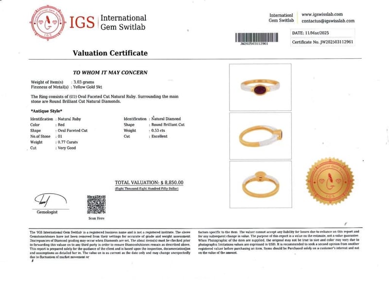 9CT YELLOW GOLD RUBY AND DIAMOND RING Ring Yellow Gold 9K Natural Ruby : 0.77 Carat Natural Diamond : 0.53 Carat Item Weight : 3.03 G Valuations Provided by an Independent Third-Party Professional Not Directly Associated With Lloyds Auctions at AUD $8850This valuation has been conducted by an independent third-party professional. The valuation amount is an assessment by the issuing valuer and does not reflect the auction value of the item. Any inquiries regarding the valuation should be directed to the issuing valuer (refer to contact details on the certificate), as Lloyds Auctions has no affiliation or influence over the valuation, the valuer, or the stated amount. Condition: Good - Refer Images 0586170+112961