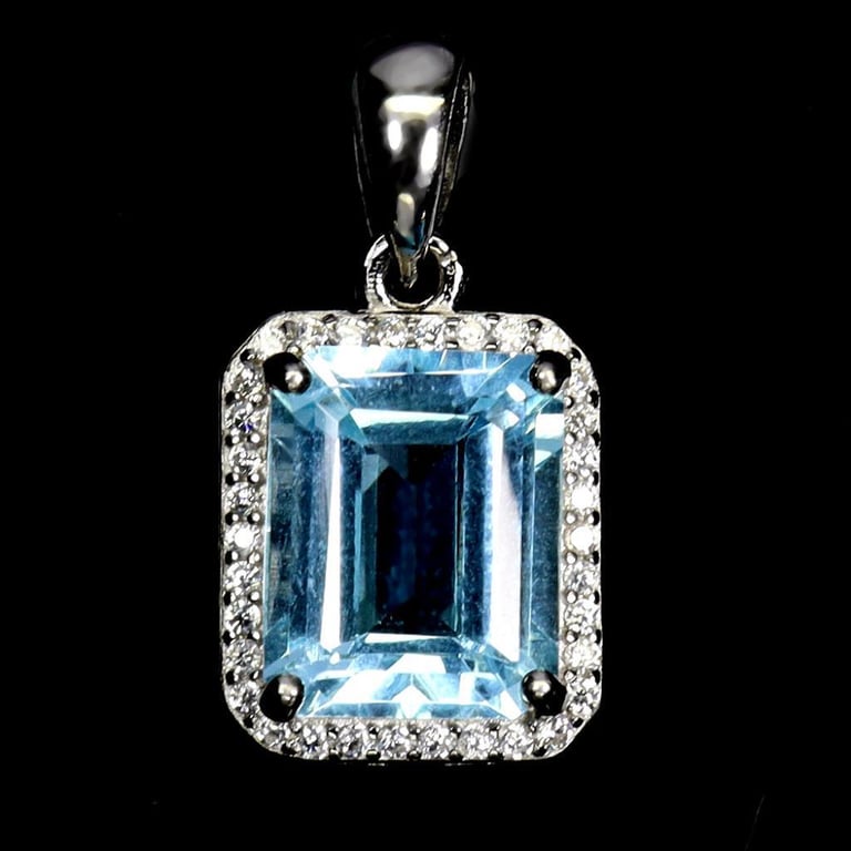 Natural Sky Blue Topaz Pendant. Made In Solid Sterling Silver And Plated In14K White Gold. Features Natural Octagonal Facet Sky Blue Topaz And Sparkling Czs. Pendant Measures 20X10Mm