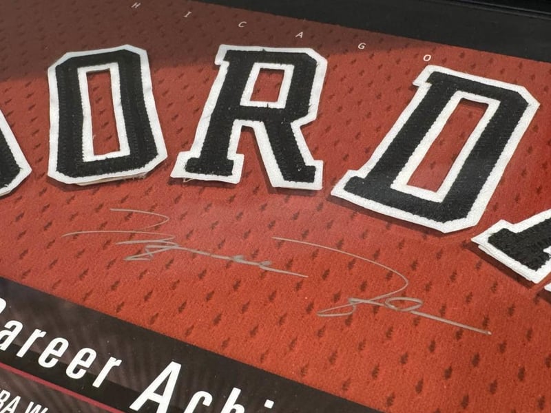 MICHAEL JORDAN SIGNED UDA CAREER ACHIEVEMENTS EDITION This Is An Incredible Upper Deck Authenticated Hand Signed Michael Jordan Career Achievements Edition Featuring A Beautiful Original Signature Of The Greatest Of All Time Michael Jordan In Silver With Original Paperwork And Matching Hologram From Upper Deck Authenticated. The Print And Name Patches Are In Mint Condition, Beautifully Presented In A Black Timber Frame. Framed Dimensions Are 530Mm Wide X 430Mm High Condition: Good - Refer To Images 488292+334118