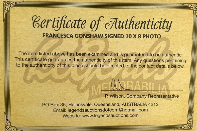 FRANCESCA GONSHAW SIGNED 'ALLO ALLO'Francesca Gonshaw Personally Signed 'Allo Allo' 10 X 8 Photo. Francesca Gonshaw Is An English Former Actress Who Appeared In Television, Theatre And Cinema Productions In The 1980S. From 1982 To 1987, She Appeared As Maria Recamier In The Bbc'S 'Allo 'Allo! A Television Situation Comedy Series Set In Occupied France During World War Ii. The Item Is Accompanied By A Certificate Of Authenticity.584946+39