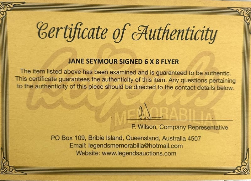 Jane Seymour Personally Signed 6 X 8 Flyer. Jane Seymour Is A British Actress. After Making Her Screen Debut As An Uncredited Teenage Extra In The 1969 Musical Comedy Oh! The Item Is Accompanied By A Certificate Of Authenticity.