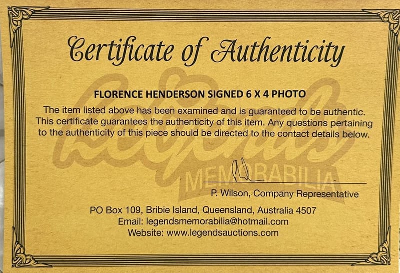 Florence Henderson Personally Signed 6 X 4 Photo. Florence Henderson Was An American Singer And Actress. With A Career Spanning Six Decades, She Is Best Known For Her Starring Role As Carol Brady On The Abc Sitcom The Brady Bunch. The Item Is Accompanied By A Certificate Of Authenticity.