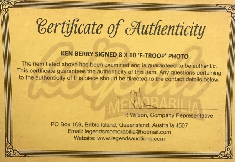 Ken Berry Personally Signed 8 X 10 "F-Troop" Photo. Ken Berry Was An American Actor, Comedian, Dancer, And Singer. Berry Starred On The Television Series F Troop, Mayberry R.F.D. And Mama'S Family. The Item Is Accompanied By A Certificate Of Authenticity.