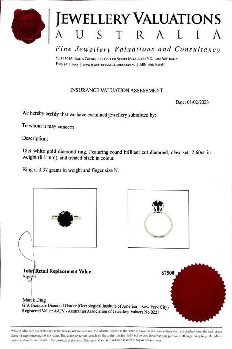 18KT WHITE GOLD DIAMOND RING Total Item Weight: 3.37gms Featuring Round Brilliant Cut Diamond, Claw Set, 2.60Ct In Weight (8.1 Mm), And Treated Black In Colour. Finger Size N. Jewellery Valuations Provided By A Third Party Professional Not Directly Associated With Lloyds Auctions at AUD $7500This Insurance Valuation has been provided by a registered Jewellery Valuer and is intended for insurance purposes only. The valuation amount has no bearing on the auction value of the item. Any questions regarding the valuation should be directed to the issuing Valuer (refer to contact details on the certificate) as Lloyds have no association or relationship with the Valuer or the valuation amount contained within the valuation. Condition: Excellent- Refer Images 0162901+229CROSSDOCK