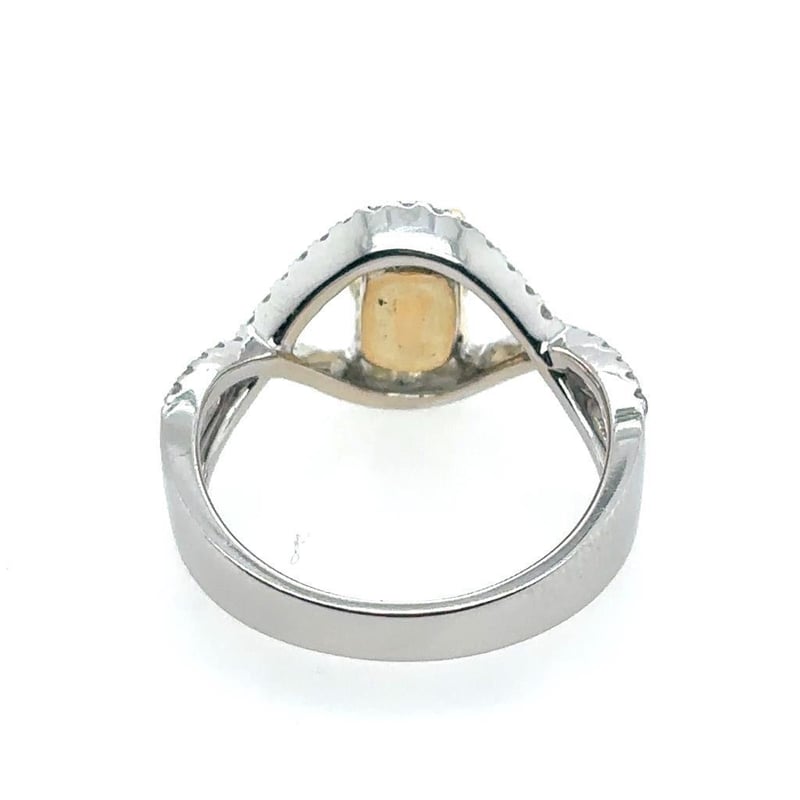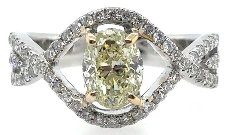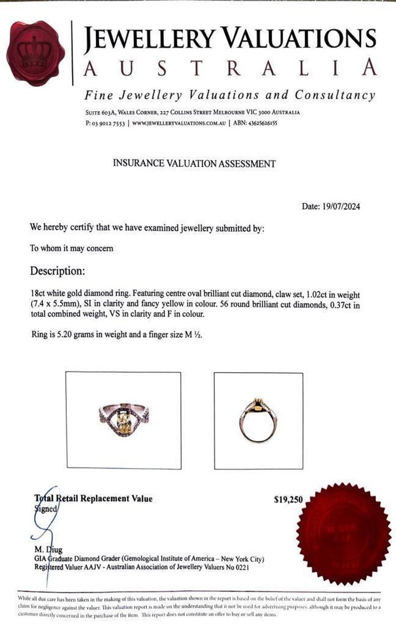 18CT WHITE GOLD DIAMOND RING Total Item Weight: 5.2gms This 18Ct White Gold Ring Features 1 X 1.02Ct Oval Brilliant Cut Claw Set Diamond Measuring 7.4Mm X 5.5Mm, Si In Clarity And Fancy Yellow In Colour. This Ring Also Features 56 X Round Brilliant Cut Diamonds, 0.37Ctd In Total Combined Weight, Vs In Clarity And F In Colour. Jewellery Valuations Provided By A Third Party Professional Not Directly Associated With Lloyds Auctions at AUD $19250This Insurance Valuation has been provided by a registered Jewellery Valuer and is intended for insurance purposes only. The valuation amount has no bearing on the auction value of the item. Any questions regarding the valuation should be directed to the issuing Valuer (refer to contact details on the certificate) as Lloyds have no association or relationship with the Valuer or the valuation amount contained within the valuation. Condition: Excellent- Refer Images 0162901+147CROSSDOCK