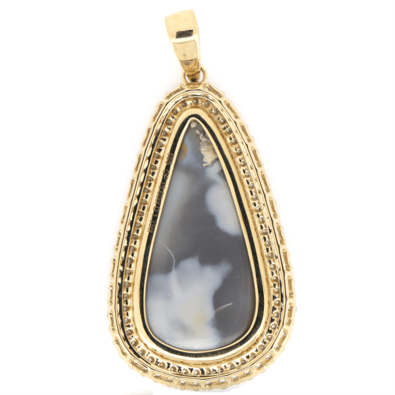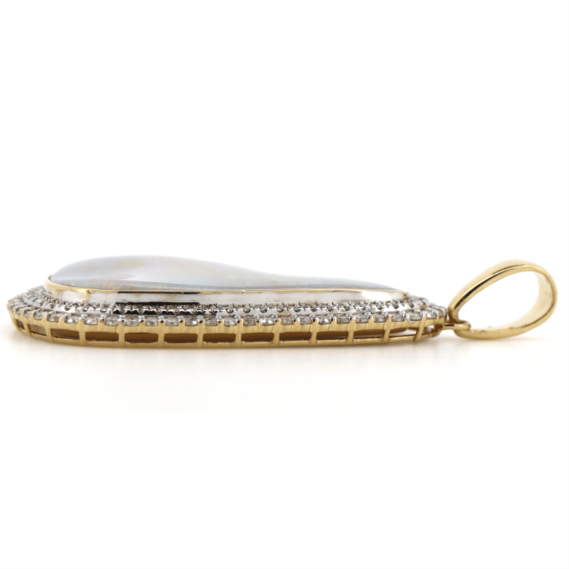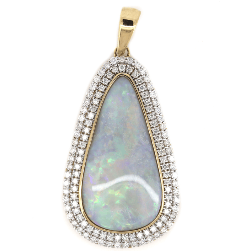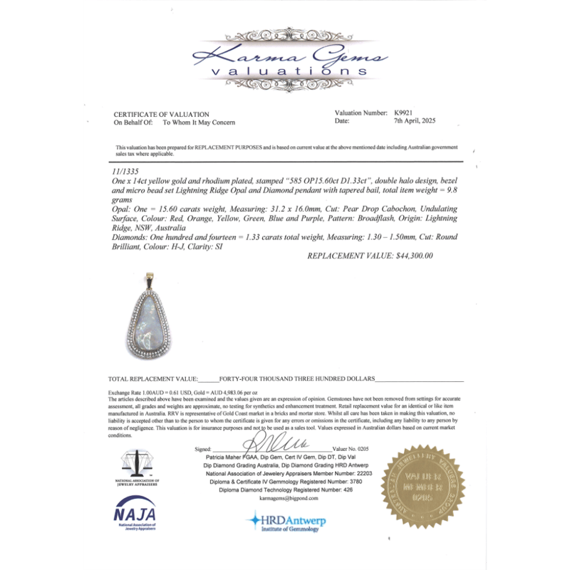 14K YELLOW GOLD, 15.60CT LIGHTNING RIDGE OPAL AND DIAMOND, STATEMENT PENDANT. THE CENTRE FEATURES, ONE PEAR DROP CABOCHON CUT, FLASHES OF RED, ORANGE, YELLOW, GREEN, BLUE AND PURPLE, LIGHTNING RIDGE OPAL (15.60CT), CLAW SET. SURROUNDING THE CENTRE ARE, 20 ROUND BRILLIANT CUT, DIAMONDS (1.33CT TDW, H-J COLOUR, SI CLARITY), MICRO-BEAD SET. Valuations Provided by an Independent Third-Party Professional Not Directly Associated With Lloyds Auctions at AUD $44300This valuation has been conducted by an independent third-party professional. The valuation amount is an assessment by the issuing valuer and does not reflect the auction value of the item. Any inquiries regarding the valuation should be directed to the issuing valuer (refer to contact details on the certificate), as Lloyds Auctions has no affiliation or influence over the valuation, the valuer, or the stated amount. Condition: Good - Refer Images 0645857+5285