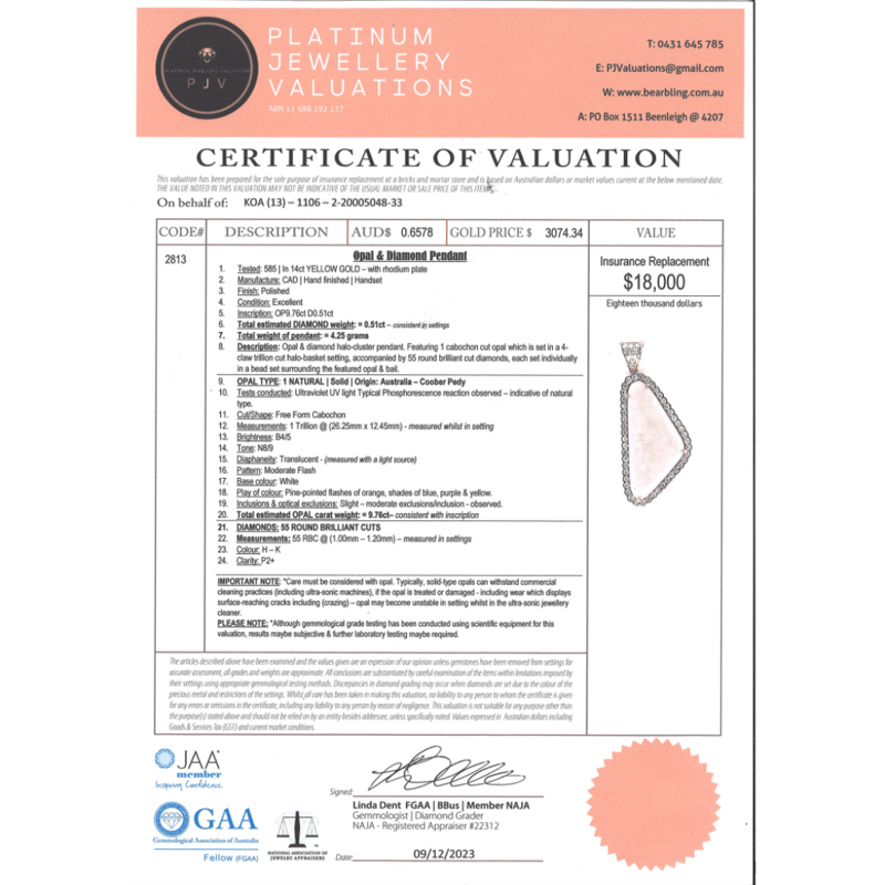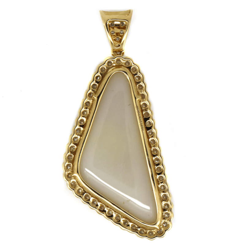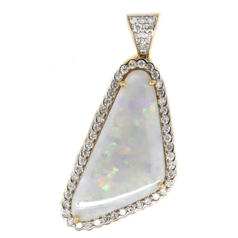 14K YELLOW GOLD, 9.76CT AUSTRALIAN COOBER PEDY OPAL AND DIAMOND, HALO PENDANT. THE CENTRE FEATURES, ONE FREE FORM CABOCHON CUT, WHITE SOLID, AUSTRALIAN COOBER PEDY OPAL (9.76CT, ORANGE, BLUE, PURPLE AND YELLOW COLOUR PLAY, MODERATE FLASH PATTERN), CLAW SET. SURROUNDING THE CENTRE AND DECORATING THE BAIL ARE, 55 ROUND BRILLIANT CUT, DIAMONDS (0.51CT TDW, H-K COLOUR, P2+ CLARITY), BEAD SET.