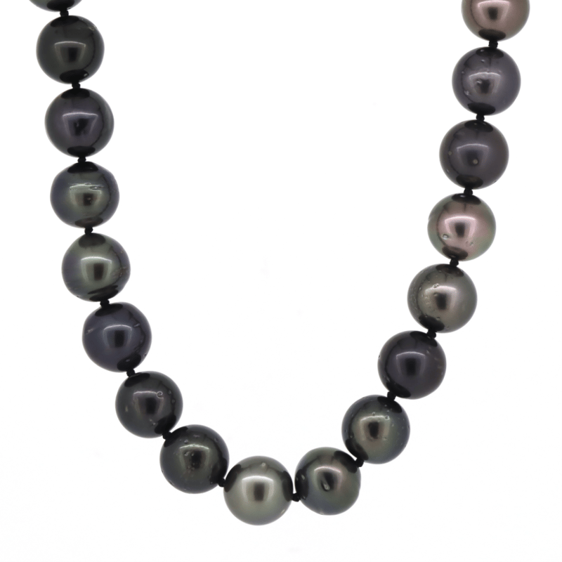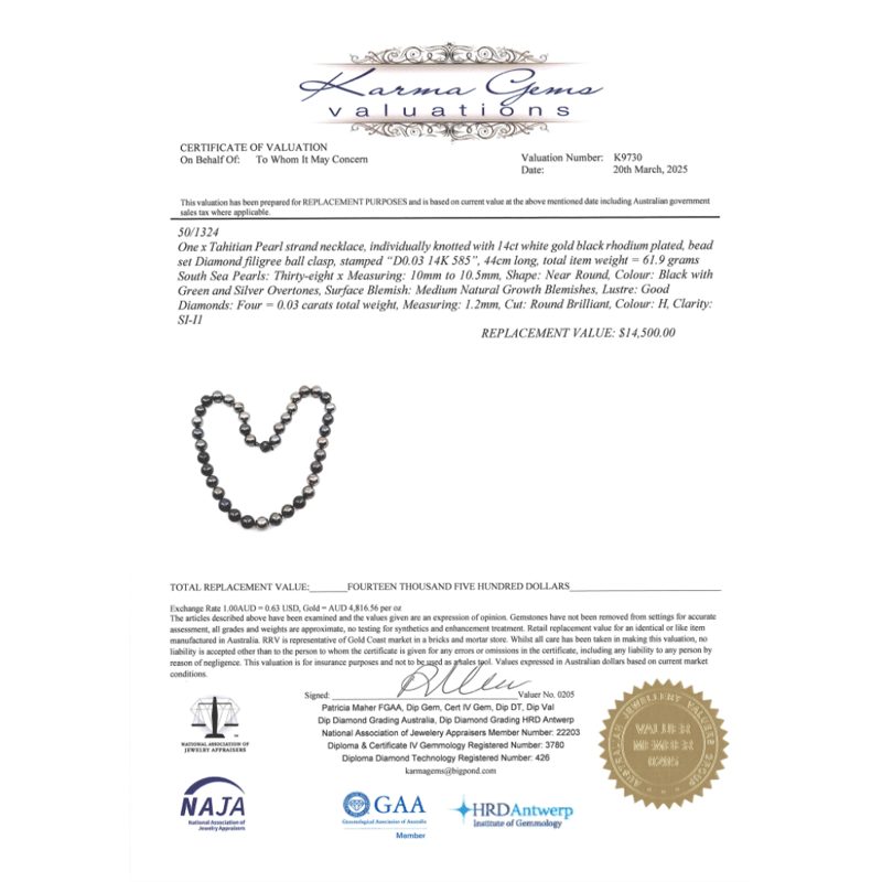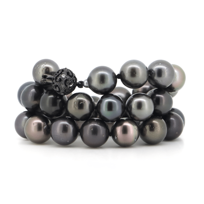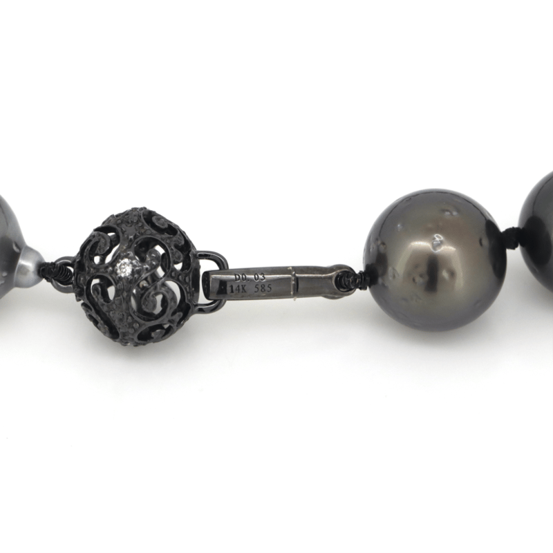 14K WHITE GOLD, BLACK CULTURED TAHITIAN PEARL AND DIAMOND, STRAND NECKLACE. THE DESIGN FEATURES, 38 NEAR-ROUND, BLACK WITH GREEN/SILVER OVERTONES, CULTURED TAHITIAN PEARLS (10MM-10.5MM SIZE, MEDIUM LUSTRE, NATURAL GROWTH BLEMISHES). EMBELLISHING THE 14K WHITE GOLD (BLACK RHODIUM PLATED), FILIGREE BALL CLASP ARE, 4 ROUND BRILLIANT CUT, DIAMONDS (0.03CT TDW, H COLOUR, SI-I1 CLARITY), BEAD SET. LENGTH IS 44CM.