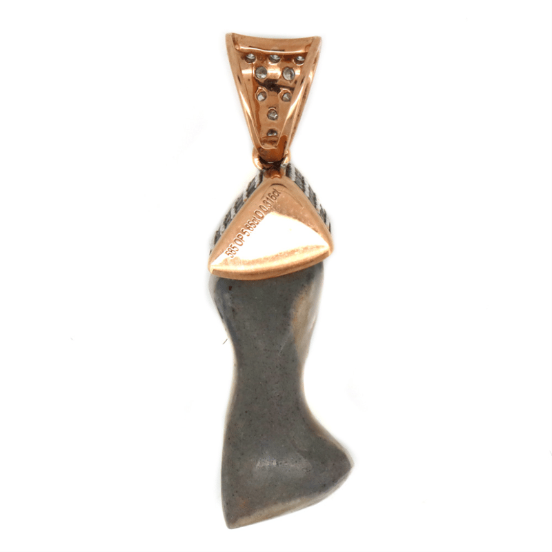 14K ROSE GOLD, 5.85CT AUSTRALIAN ANDAMOOKA OPAL AND DIAMOND, HALO PENDANT. THE CENTRE DESIGN FEATURES, ONE NATURAL FREEFORM, SOLID WHITE, AUSTRALIAN ANDAMOOKA OPAL (5.85CT, PINE WITH FLASHES ORANGE, SHADES OF BLUE, PURPLE AND YELLOW, MODERATE EXCLUSION/INCLUSION), CAPPED. DECORATING THE BAIL ARE, 51 ROUND BRILLIANT CUT, DIAMONDS (0.316CT TDW, H-K COLOUR, P2+ CLARITY), BEAD SET.