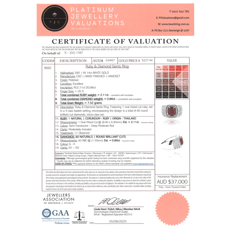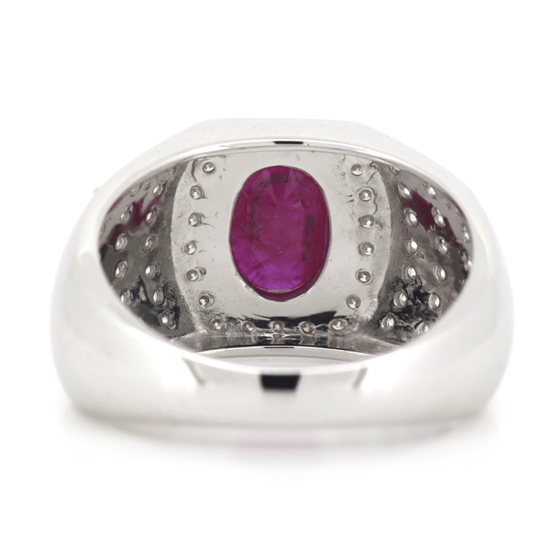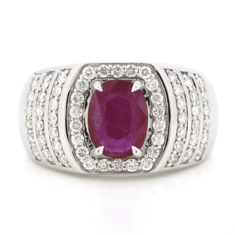 14K WHITE GOLD, RUBY AND DIAMOND, GENTS RING. THE CENTRE FEATURES, ONE OVAL CUT, DEEP MODERATE RED, RUBY (2.11CT, MODERATELY INCLUDED), 4 CLAW SET. ENCOMPASSING THE CENTRE ARE, 60 ROUND BRILLIANT CUT, DIAMONDS (0.86CT TDW, G-H COLOUR, SI1-SI2 CLARITY), MICRO-CLAW SET. RING SIZE R 1/2.