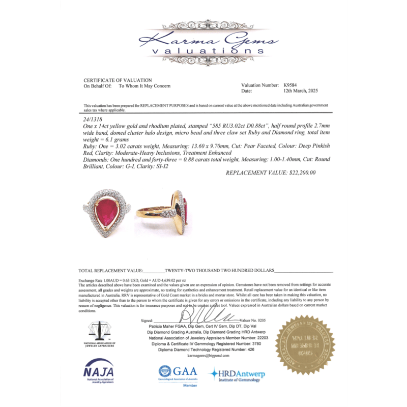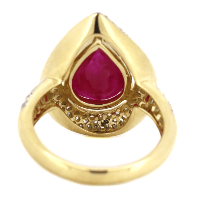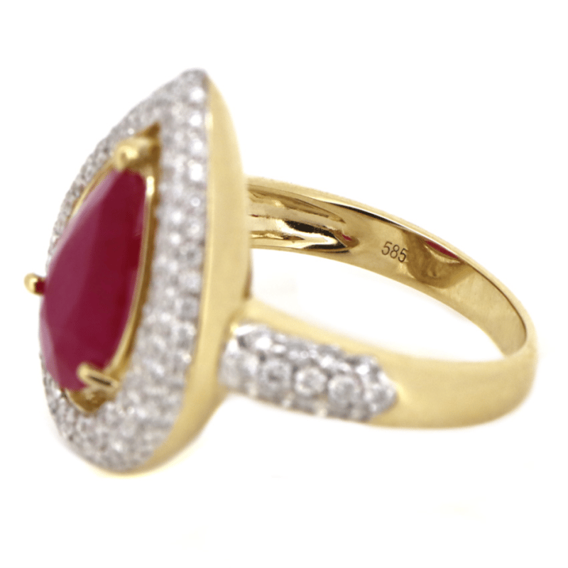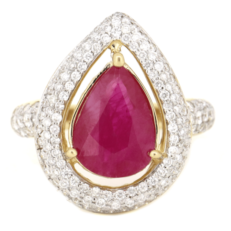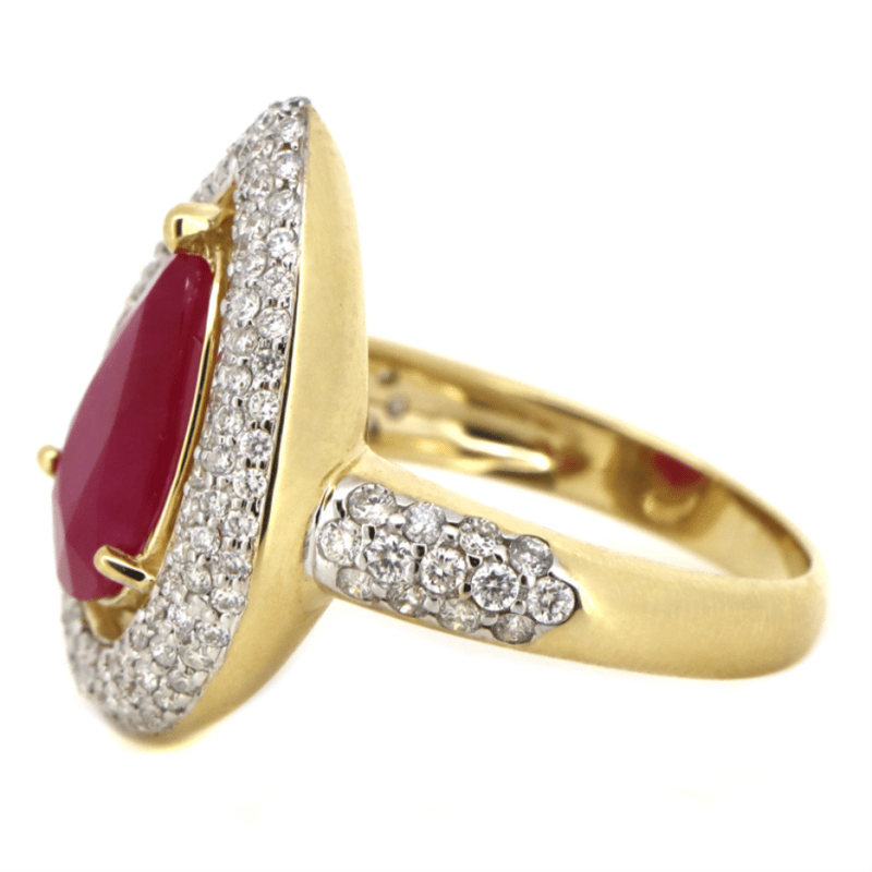 14K YELLOW GOLD, RUBY AND DIAMOND, HALO CLUSTER RING. THE CENTRE FEATURES, ONE PEAR FACETED CUT, DEEP PINKISH-RED, RUBY (3.02CT, MODERATE-HEAVY INCLUSIONS, ENHANCED), CLAW SET. SURROUNDING THE CENTRE IN A CLUSTER HALO AND DECORATING THE BAND ARE, 143 ROUND BRILLIANT CUT, DIAMONDS (0.88CT TDW, G-I COLOUR, SI-I2 CLARITY), MICRO-BEAD SET. RING SIZE N.