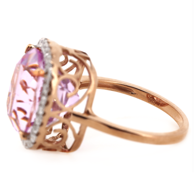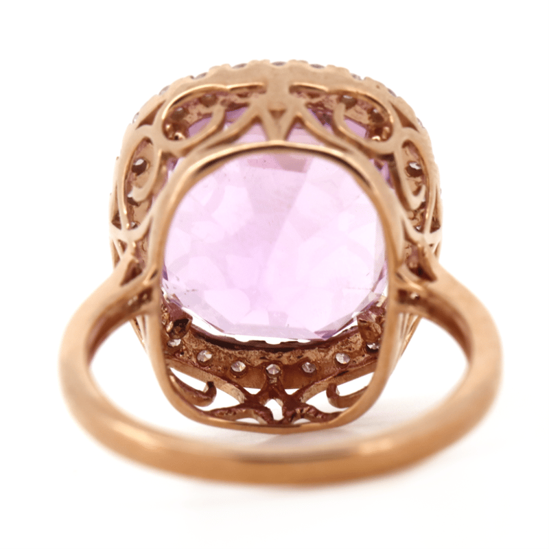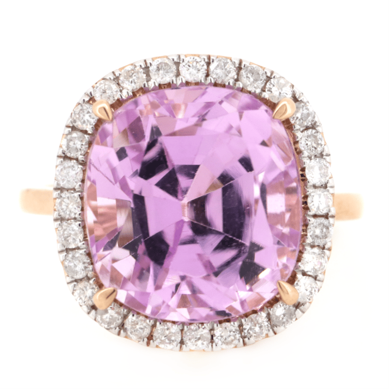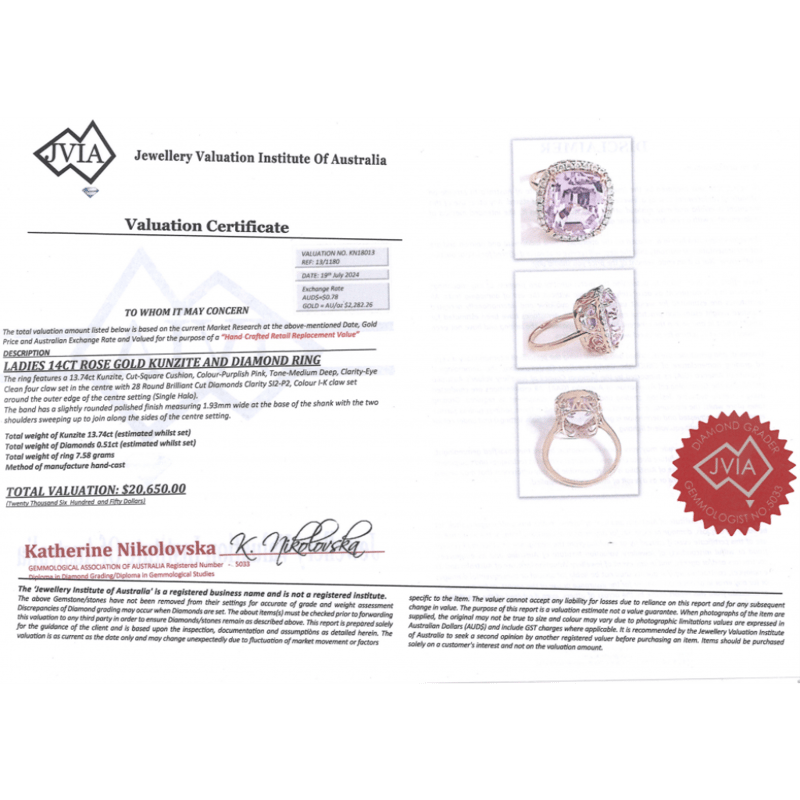 14K ROSE GOLD, 13.74CT KUNZITE AND DIAMOND, STATEMENT RING. THE CENTRE FEATURES, ONE CUSHION CUT, MEDIUM DEEP PURPLISH-PINK, KUNZITE (13.74CT, VERY MINOR EYE VISIBLE INCLUSIONS), CLAW SET. SURROUNDING THE CENTRE IN A HALO ARE, 28 ROUND BRILLIANT CUT, DIAMONDS (0.51CT TDW, I-K COLOUR, SI2-P2 CLARITY), MICRO-CLAW SET. RING SIZE Q. Valuations Provided by an Independent Third-Party Professional Not Directly Associated With Lloyds Auctions at AUD $20650This valuation has been conducted by an independent third-party professional. The valuation amount is an assessment by the issuing valuer and does not reflect the auction value of the item. Any inquiries regarding the valuation should be directed to the issuing valuer (refer to contact details on the certificate), as Lloyds Auctions has no affiliation or influence over the valuation, the valuer, or the stated amount. Condition: Good - Refer Images 0645857+5218
