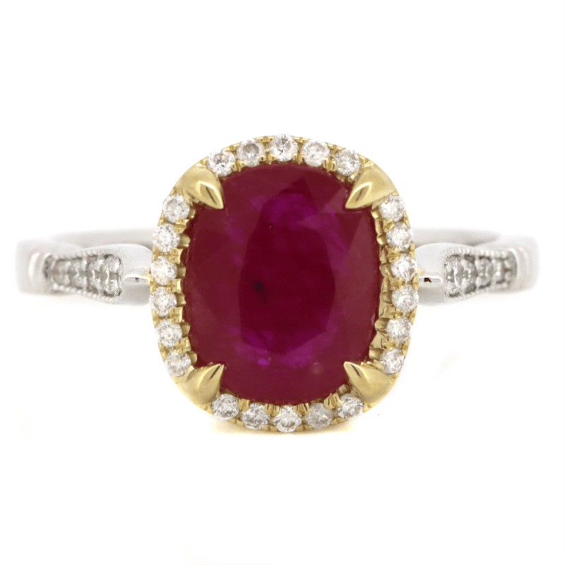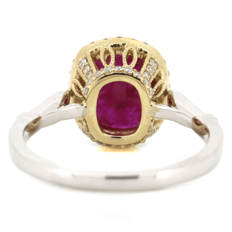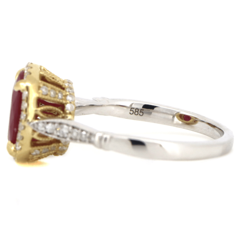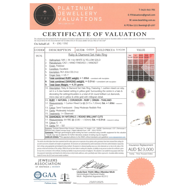 14K WHITE/YELLOW GOLD, RUBY AND DIAMOND, HALO RING. THE CENTRE FEATURES, ONE CUSHION CUT, DEEP MODERATE REDDISH-PINK, RUBY (1.83CT, MODERATE INCLUSIONS), 4 CLAW SET IN YELLOW GOLD. SURROUNDING THE CENTRE IN A HALO AND DECORATING THE SETTING/SHOULDERS ARE, 64 ROUND BRILLIANT CUT, DIAMONDS (0.31CT TDW, G-H COLOUR, SI1-SI2 CLARITY), MICRO-CLAW SET IN YELLOW/WHITE GOLD WITH MILLEGRAIN DETAIL. RING SIZE N 1/2. Valuations Provided by an Independent Third-Party Professional Not Directly Associated With Lloyds Auctions at AUD $23000This valuation has been conducted by an independent third-party professional. The valuation amount is an assessment by the issuing valuer and does not reflect the auction value of the item. Any inquiries regarding the valuation should be directed to the issuing valuer (refer to contact details on the certificate), as Lloyds Auctions has no affiliation or influence over the valuation, the valuer, or the stated amount. Condition: Good - Refer Images 0645857+5289