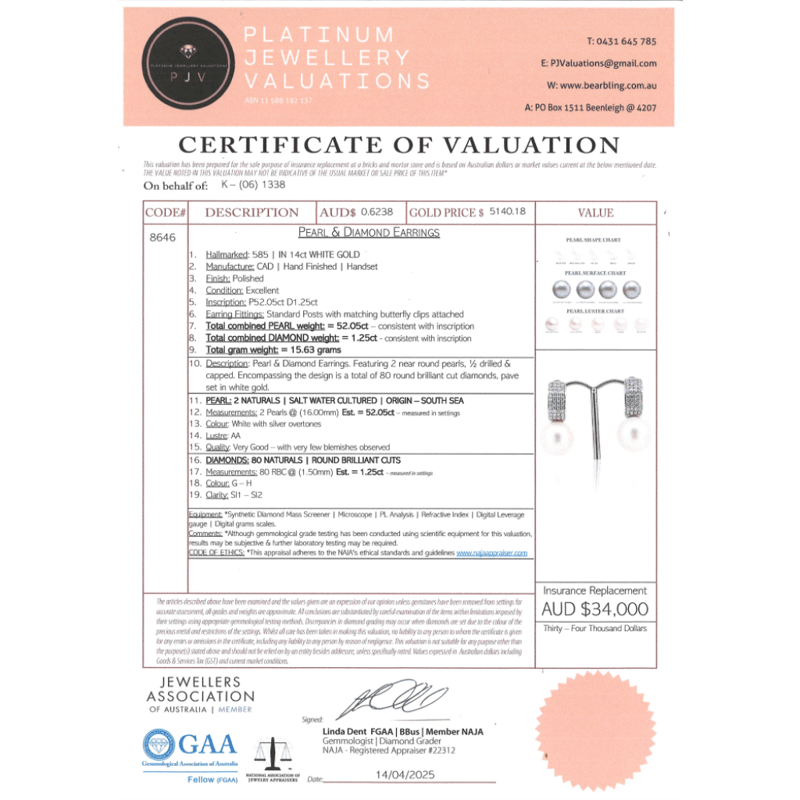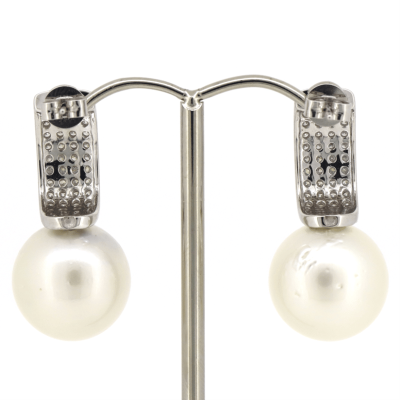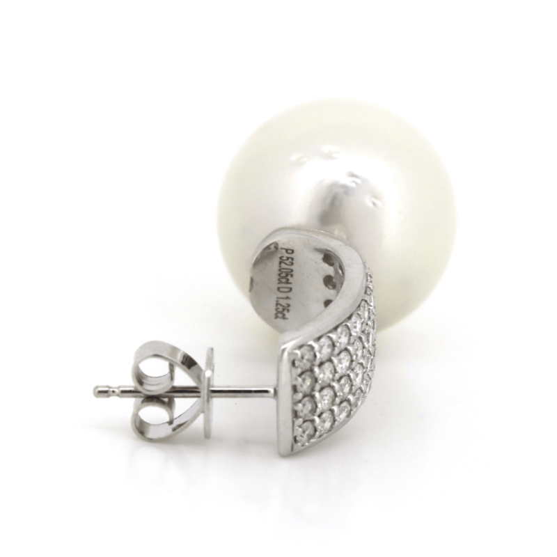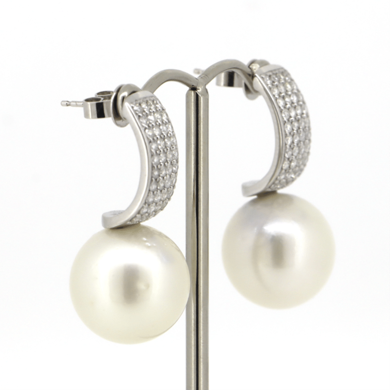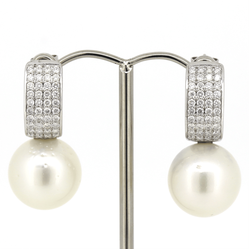 14K WHITE GOLD, WHITE CULTURED SOUTH SEA PEARL AND DIAMOND, DROP EARRINGS. THE DESIGN FEATURES, 2 NEAR ROUND, WHITE WITH SILVER OVERTONES, CULTURED SOUTH SEA PEARLS 16.00MM, LUSTRE AA), 1/2 DRILLED AND CAPPED. ENCOMPASSING THE DESIGN ARE, 80 ROUND BRILLIANT CUT, DIAMONDS (1.25CT TDW, G-H COLOUR, SI1-SI2 CLARITY), PAVE SET. EARRINGS HAVE POST BACKS AND COME WITH 14K WHITE GOLD BACKS.