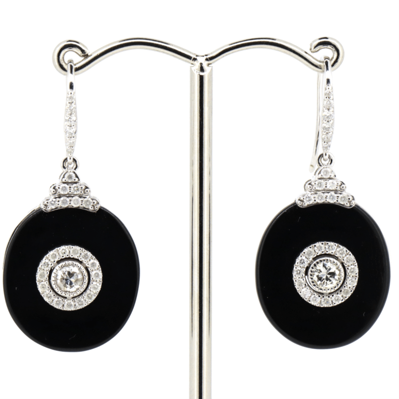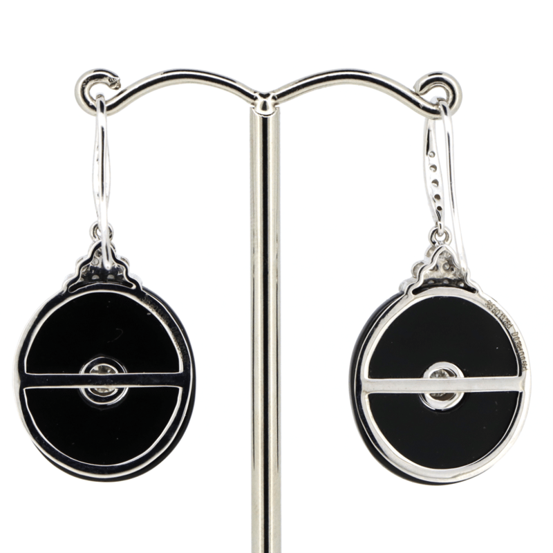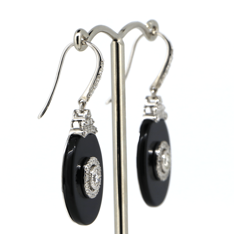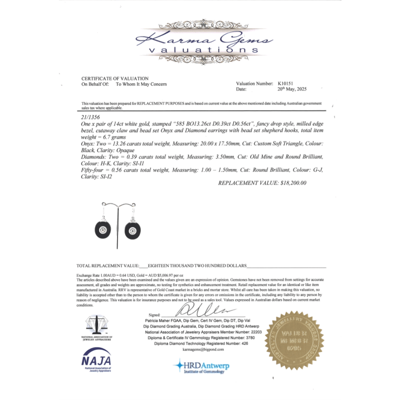 14K WHITE GOLD, ONYX AND DIAMOND, DROP EARRINGS. THE DESIGN FEATURES, 2 CUSTOM OVAL CUTS, BLACK, ONYX (13.26CT TSW, OPAQUE). CENTERING THE ONYX ARE, 2 OLD MINE CUT, DIAMONDS (0.39CT TDW, H-K COLOUR, SI-I1 CLARITY), CUTAWAY CLAW SET. ENCOMPASSING THE CENTRE AND DECORATING THE HOOKS ARE, 54 ROUND BRILLIANT CUT, DIAMONDS (0.56CT TDW, G-J COLOUR, SI-I2 CLARITY), BEAD/BEZEL SET. THE EARRINGS FEATURE SHEPHERD HOOKS. TOTAL WEIGHT 6.7GRAMS. Valuations Provided by an Independent Third-Party Professional Not Directly Associated With Lloyds Auctions at AUD $18200This valuation has been conducted by an independent third-party professional. The valuation amount is an assessment by the issuing valuer and does not reflect the auction value of the item. Any inquiries regarding the valuation should be directed to the issuing valuer (refer to contact details on the certificate), as Lloyds Auctions has no affiliation or influence over the valuation, the valuer, or the stated amount. Condition: Good - Refer Images 0645857+5286