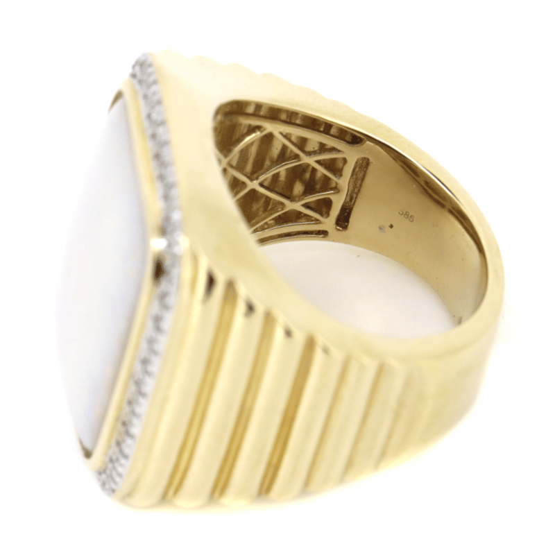 14K YELLOW GOLD, 14.90CT ANDAMOOKA OPAL AND DIAMOND, HALO GENTS RING. THE CENTRE FEATURES, ONE CUSHION CABOCHON CUT, ANDAMOOKA OPAL (14.90CT, FLASHES OF BLUE COLOUR PLAY), 4 CLAW SET. SURROUNDING THE CENTRE IN A HALO AND DECORATING SHOULDERS ARE, 42 ROUND BRILLIANT CUT, DIAMONDS (0.42CT TDW, G-H COLOUR, SI2-P1 CLARITY), BEAD SET. RING SIZE V 1/2.