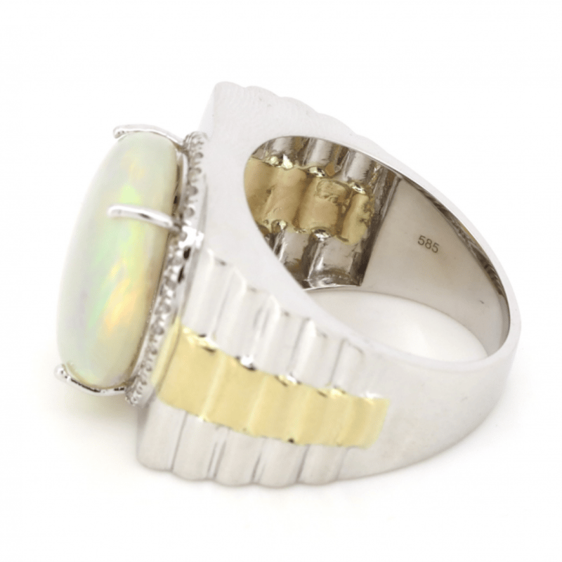 14K WHITE/YELLOW GOLD, 11.07CT AUSTRALIAN OPAL AND DIAMOND, STATEMENT RING. THE CENTRE FEATURES, ONE OVAL CABOCHON CUT, AUSTRALIAN OPAL (11.07CT, GREEN, VIOLET AND BLUE STRONG COLOUR PLAY), 4 CLAW SET. SURROUNDING THE CENTRE IN A HALO ARE, 36 ROUND BRILLIANT CUT, DIAMONDS (0.35CT TDW, J-K COLOUR, SI1-SI2 CLARITY), MICRO-CLAW SET. RING SIZE T.