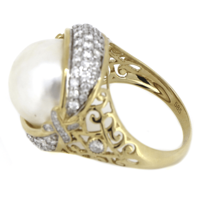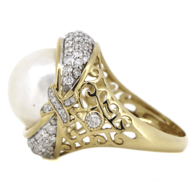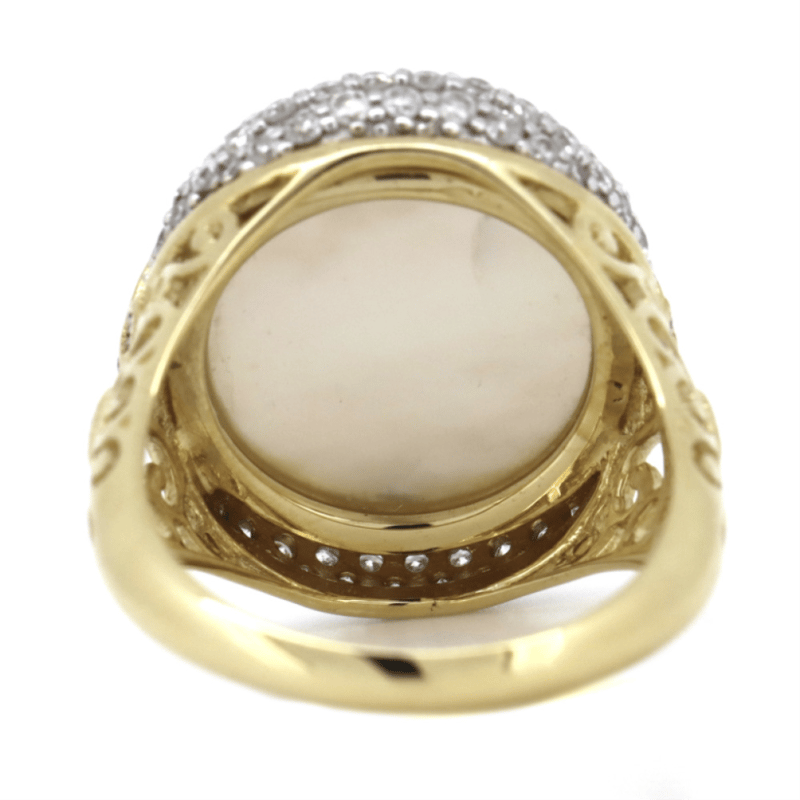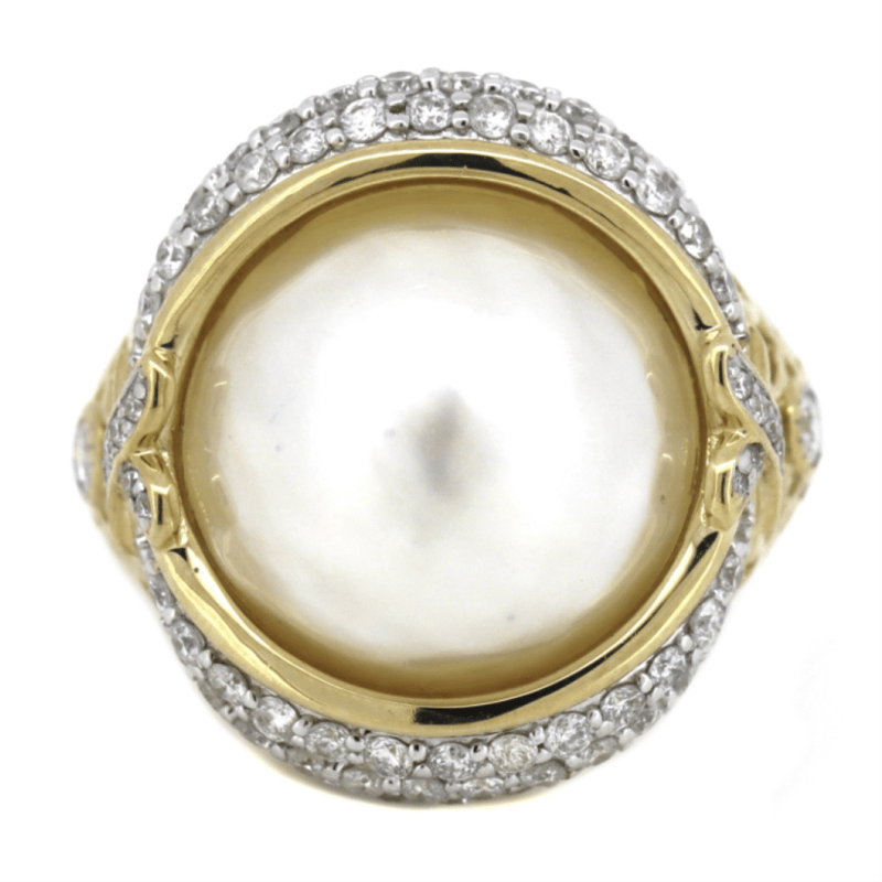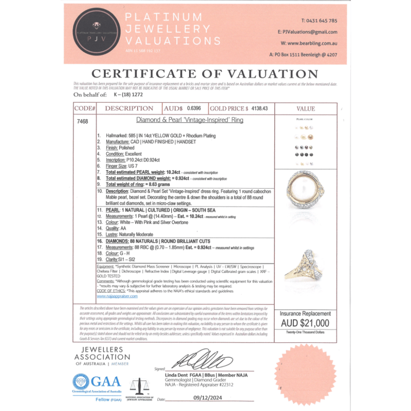 14K YELLOW GOLD, WHITE CULTURED MABE PEARL AND DIAMOND, VINTAGE INSPIRED RING. THE CENTRE FEATURES, ONE ROUND CABOCHON CUT, WHITE WITH PINK AND SILVER OVERTONES, CULTURED MABE PEARL (14.40MM SIZE, GOOD LUSTRE), BEZEL SET. DECORATING THE CENTRE AND SHOULDERS ARE 88 ROUND BRILLIANT CUT, DIAMONDS (0.924CT TDW, G-H COLOUR, SI2-SI2 CLARITY), MICRO CLAW SET. RING SIZE O. Valuations Provided by an Independent Third-Party Professional Not Directly Associated With Lloyds Auctions at AUD $21000This valuation has been conducted by an independent third-party professional. The valuation amount is an assessment by the issuing valuer and does not reflect the auction value of the item. Any inquiries regarding the valuation should be directed to the issuing valuer (refer to contact details on the certificate), as Lloyds Auctions has no affiliation or influence over the valuation, the valuer, or the stated amount. Condition: Good - Refer Images 0645857+5226