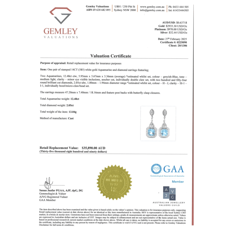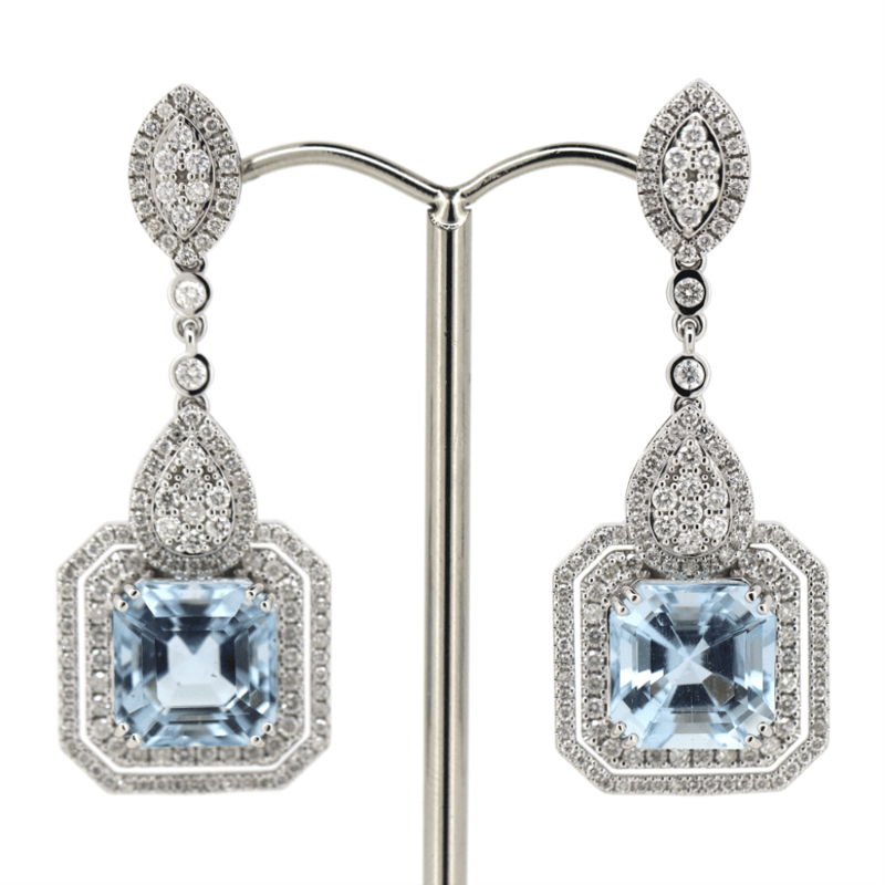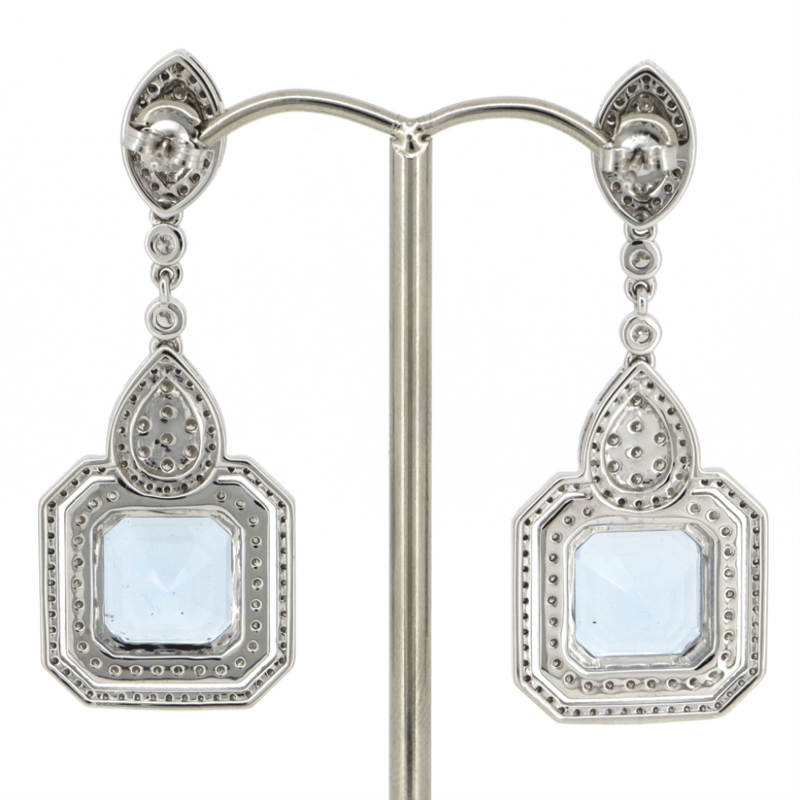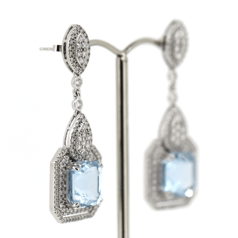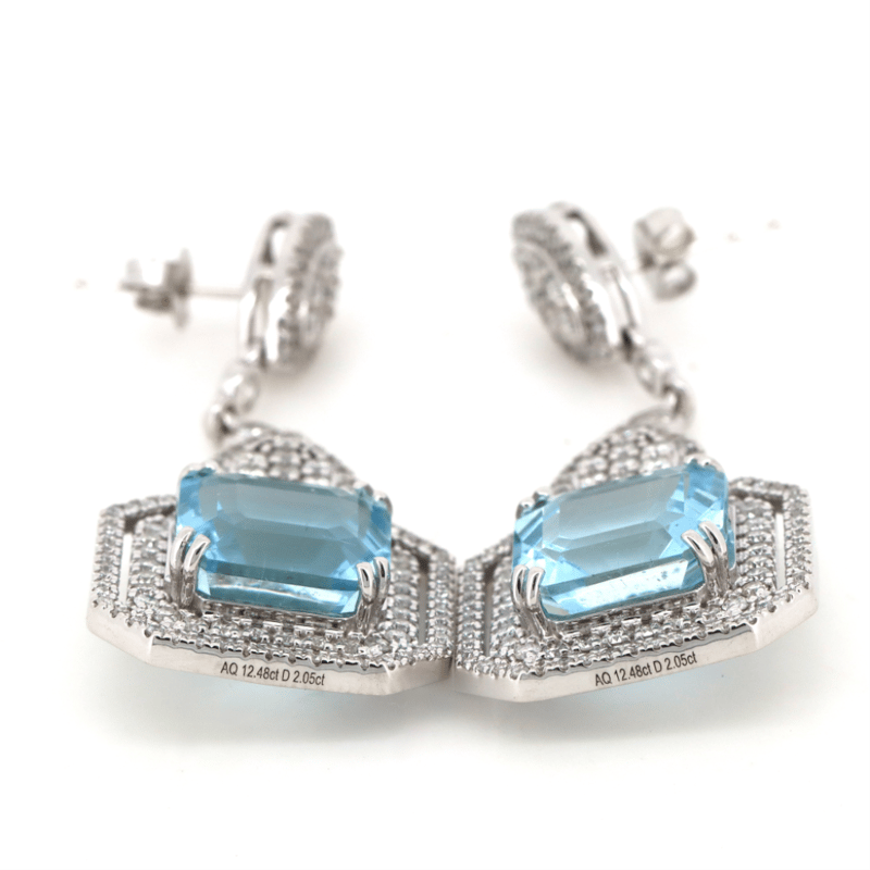 14K WHITE GOLD, AQUAMARINE AND DIAMOND, ORNATE DROP EARRINGS. THE DESIGN FEATURES, 2 ASSCHER CUT, GREYISH-BLUE, AQUAMARINES (12.48CT TSW, MINOR EYE VISIBLE INCLUSIONS), DOUBLE CLAW SET. ENCOMPASSING THE DESIGN ARE, 254 ROUND BRILLIANT CUT, DIAMONDS (2.05CT TDW, H-J COLOUR, SI-I1 CLARITY), INDIVIDUALLY BEZEL/MICRO-CLAW/BEAD SET. THE EARRINGS HAVE POST BACKS, WITH 14K WHITE GOLD BUTTERFLY CLASPS.