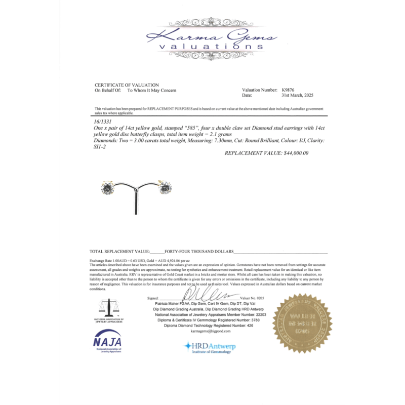 14K YELLOW GOLD, 2.19CT TDW DIAMOND, SOLITAIRE STUD EARRINGS. THE CENTRES FEATURE, 2 ROUND BRILLIANT CUT, DIAMONDS (3.00CT TDW, I-J COLOUR, SI1-2 CLARITY), DOUBLE CLAW SET. EARRINGS HAVE POST BACKS AND COME WITH 14K YELLOW GOLD BACKS. Valuations Provided by an Independent Third-Party Professional Not Directly Associated With Lloyds Auctions at AUD $44000This valuation has been conducted by an independent third-party professional. The valuation amount is an assessment by the issuing valuer and does not reflect the auction value of the item. Any inquiries regarding the valuation should be directed to the issuing valuer (refer to contact details on the certificate), as Lloyds Auctions has no affiliation or influence over the valuation, the valuer, or the stated amount. Condition: Good - Refer Images 0645857+5221