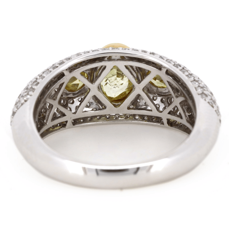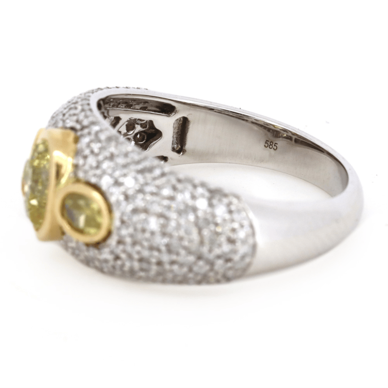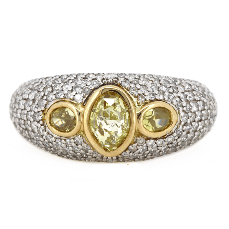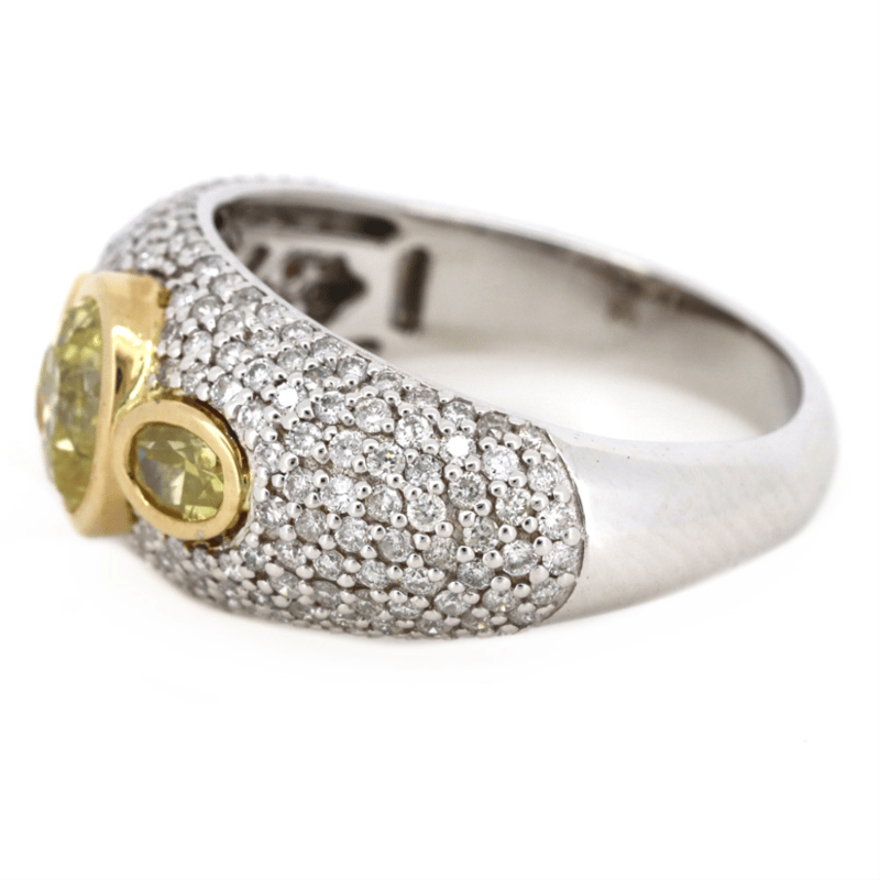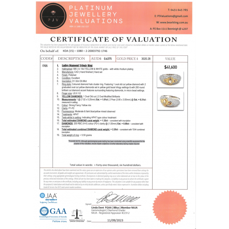 14K WHITE/YELLOW GOLD, FANCY YELLOW DIAMOND, TRILOGY CLUSTER RING. THE CENTRAL DESIGN FEATURES, ONE OVAL OLD CUT AND 2 OVAL MODIFIED BRILLIANT CUT, STRONG FANCY YELLOW, DIAMONDS (1.32CT TDW, P1-P2 CLARITY, ENHANCED), BEZEL SET IN YELLOW GOLD. ENCOMPASSING THE DESIGN ARE, 200 ROUND BRILLIANT CUT, DIAMONDS (0.88CT TDW, H-K COLOUR, P2+ CLARITY), MICRO-BEAD SET IN WHITE GOLD. RING SIZE M 1/2. Valuations Provided by an Independent Third-Party Professional Not Directly Associated With Lloyds Auctions at AUD $41600This valuation has been conducted by an independent third-party professional. The valuation amount is an assessment by the issuing valuer and does not reflect the auction value of the item. Any inquiries regarding the valuation should be directed to the issuing valuer (refer to contact details on the certificate), as Lloyds Auctions has no affiliation or influence over the valuation, the valuer, or the stated amount. Condition: Good - Refer Images 0645857+5264