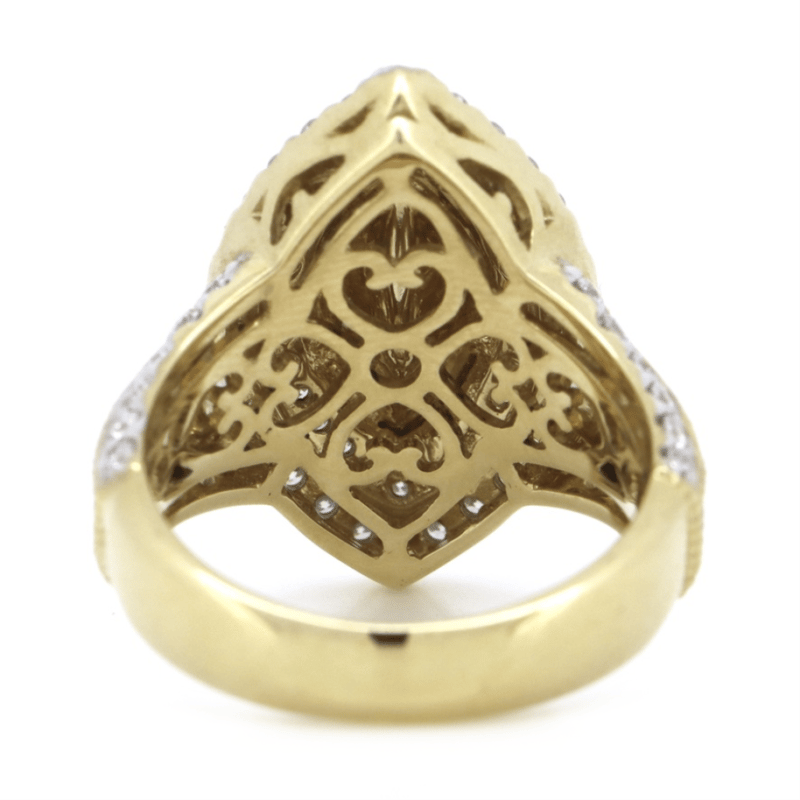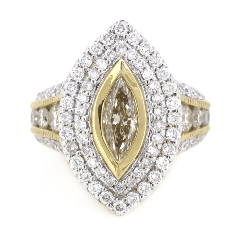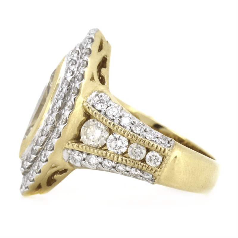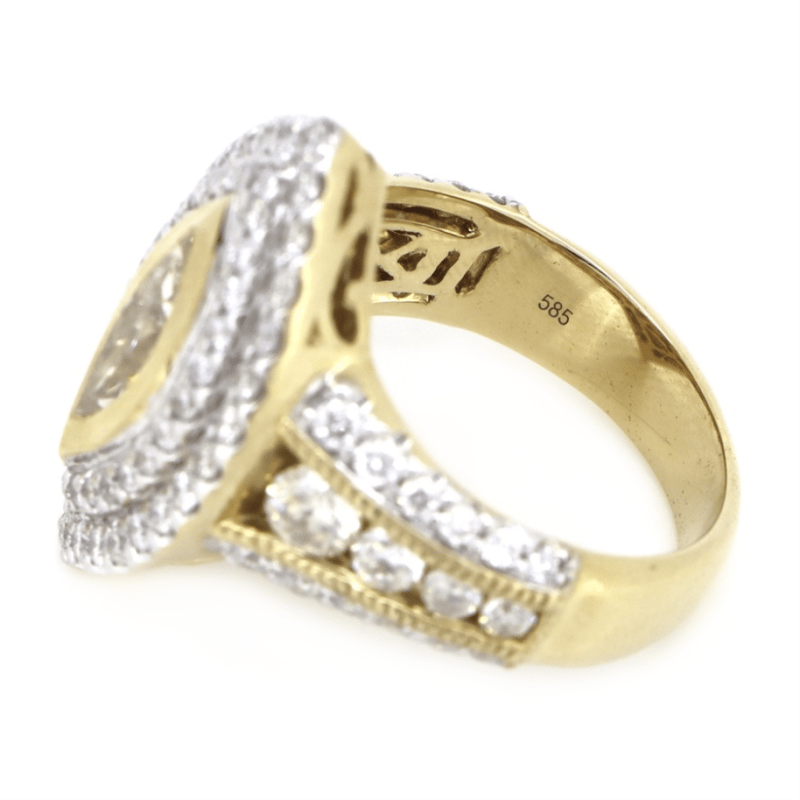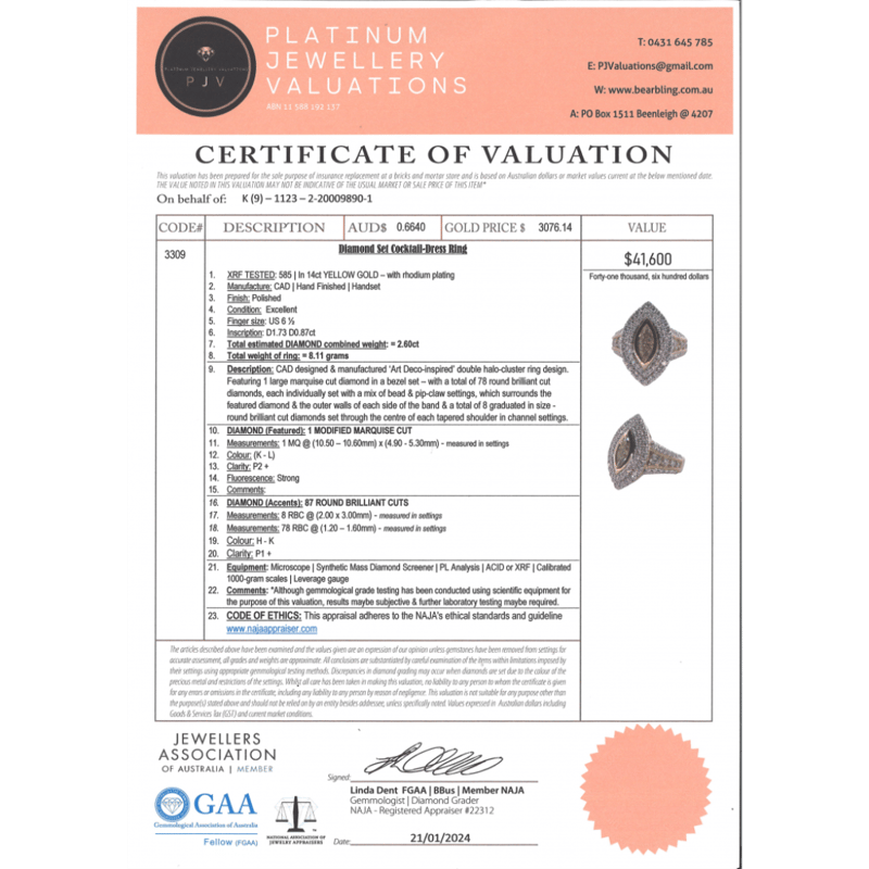 14K YELLOW GOLD AND DIAMOND, DECORATIVE CLUSTER RING. THE CENTRE FEATURES, ONE MODIFIED MARQUISE CUT, DIAMOND (1.73CT, K-L COLOUR, P2+ CLARITY), BEZEL SET. SURROUNDING THE CENTRE IN A DOUBLE HALO AND DECORATING THE BAND ARE, 87 ROUND BRILLIANT CUT, DIAMONDS (0.87CT TDW, H-K COLOUR, P1+ CLARITY), BEAD/PIP-CLAW SET. RING SIZE M 1/2. Valuations Provided by an Independent Third-Party Professional Not Directly Associated With Lloyds Auctions at AUD $14600This valuation has been conducted by an independent third-party professional. The valuation amount is an assessment by the issuing valuer and does not reflect the auction value of the item. Any inquiries regarding the valuation should be directed to the issuing valuer (refer to contact details on the certificate), as Lloyds Auctions has no affiliation or influence over the valuation, the valuer, or the stated amount. Condition: Good - Refer Images 0645857+5229
