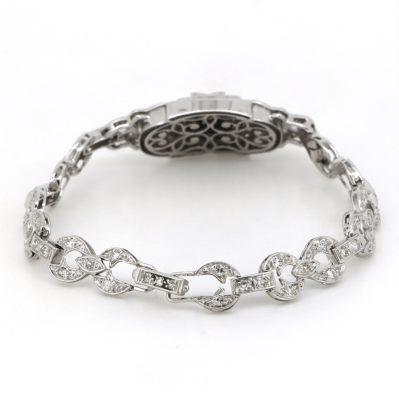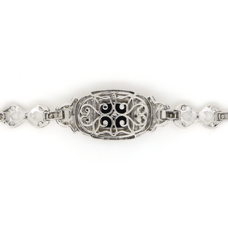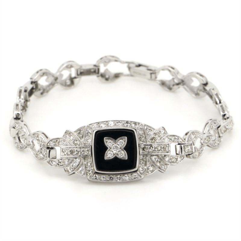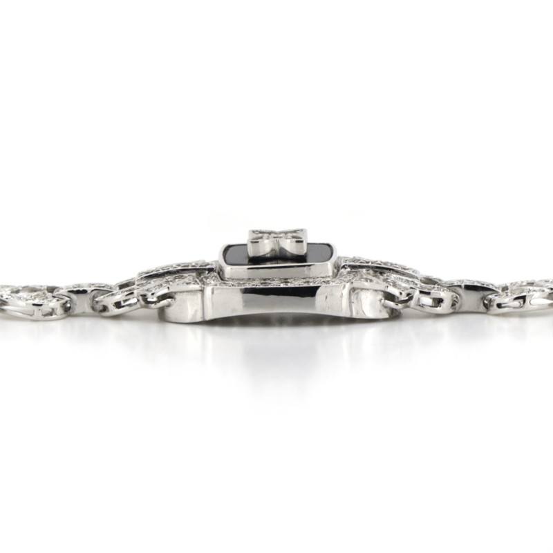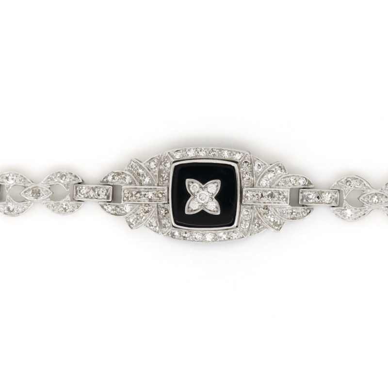 14K WHITE GOLD, BLACK ONYX AND DIAMOND, ART DECO INSPIRED BRACELET.