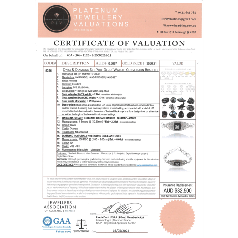 THE CENTRE DESIGN FEATURES, ONE CABOCHON CUT, BLACK, ONYX ( 2.26CT, OPAQUE), BEZEL SET. SURROUNDED BY, 108 ROUND BRILLIANT CUT, DIAMONDS (0.09CT TDW, G+ COLOUR, VS2-SI1 CLARITY), MICRO-BEAD SET. BRACELET FEATURES A FOLD OVER CLASP FITTED. BRACELET LENGTH IS 18CM.