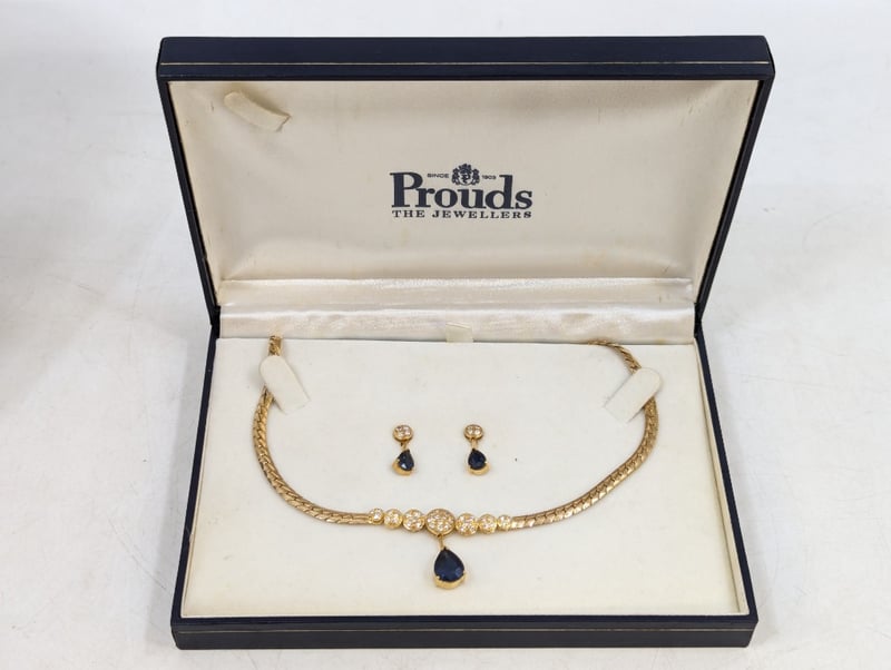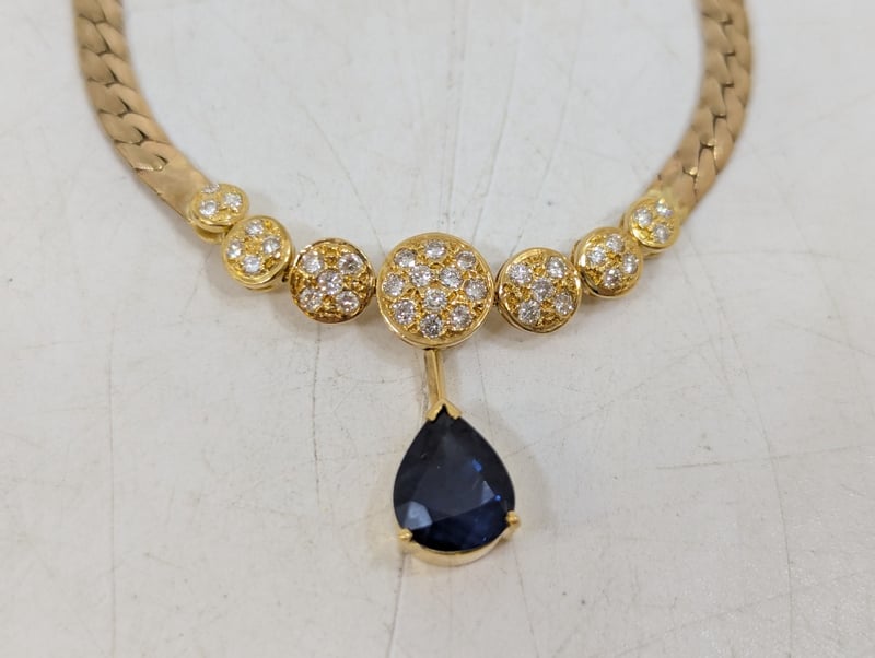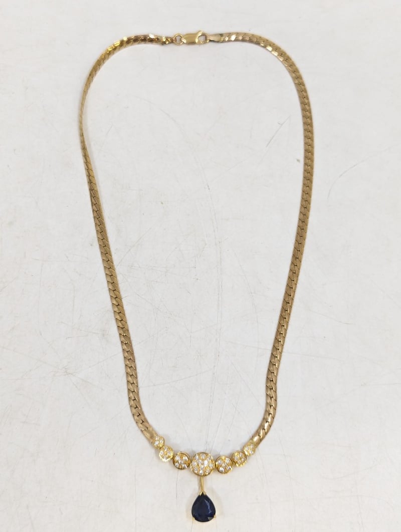 9K YELLOW GOLD SAPPHIRE AND DIAMOND EARRINGS AND CHAIN NECKLACE Chain Necklace Features 2.87Ct Blue Sapphire In Three Claw Setting, Measurement: 9.9 X 8.05 X 5.11Mm, 0.65Ct Estimated Total Carat Weight Round Brilliant Cut Diamonds In Settings Along Chain, Includes Valuation For $15,525 9K Yellow Gold Earrings Feature Two Pear Cut Brilliant Cut Blue Sapphire In Three Claw Settings, Eight Round Brilliant Cut Diamonds, Estimated 0.12Ct Total Ct Weight, Includes Valuation For $5,925 Total Item Weight: 20.61g Markings: Necklace Stamped: 375 Condition: Good - Refer To Images This valuation has been conducted by an independent third-party professional. The valuation amount is an assessment by the issuing valuer and does not reflect the auction value of the item. Any inquiries regarding the valuation should be directed to the issuing valuer (refer to contact details on the certificate), as Lloyds Auctions has no affiliation or influence over the valuation, the valuer, or the stated amount. 584955+1