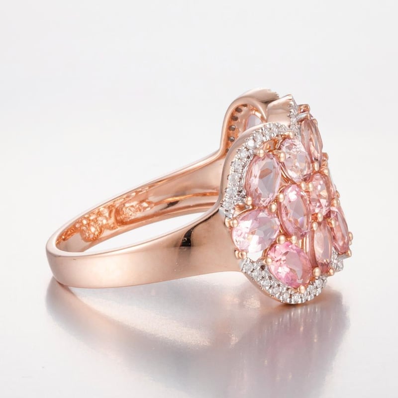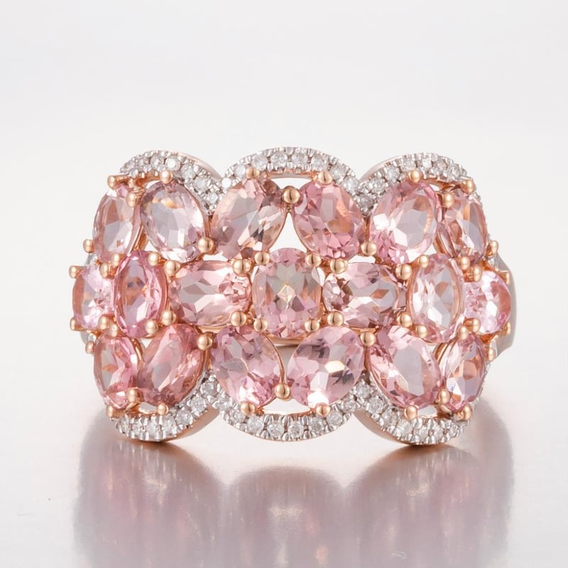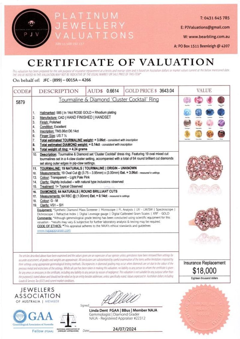 14CT ROSE GOLD TOURMALINE AND DIAMOND CLUSTER RING FEATURING CENTRE, 19 OVAL CUT, LIGHT PALE PINK TOURMALINES (3.06CT TSW, SLIGHTLY INCLUDED), BEAD SET, WITH 64 ROUND BRILLIANT CUT DIAMONDS (0.14CT TDW, G-M COLOUR, VS1-SI1 CLARITY), BEAD SET. RING SIZE O. Valuations Provided by an Independent Third-Party Professional Not Directly Associated With Lloyds Auctions at AUD $18000This valuation has been conducted by an independent third-party professional. The valuation amount is an assessment by the issuing valuer and does not reflect the auction value of the item. Any inquiries regarding the valuation should be directed to the issuing valuer (refer to contact details on the certificate), as Lloyds Auctions has no affiliation or influence over the valuation, the valuer, or the stated amount. Condition: Good - Refer Images 0586200+508