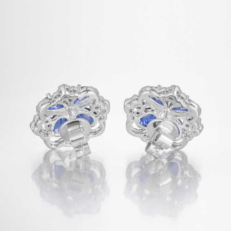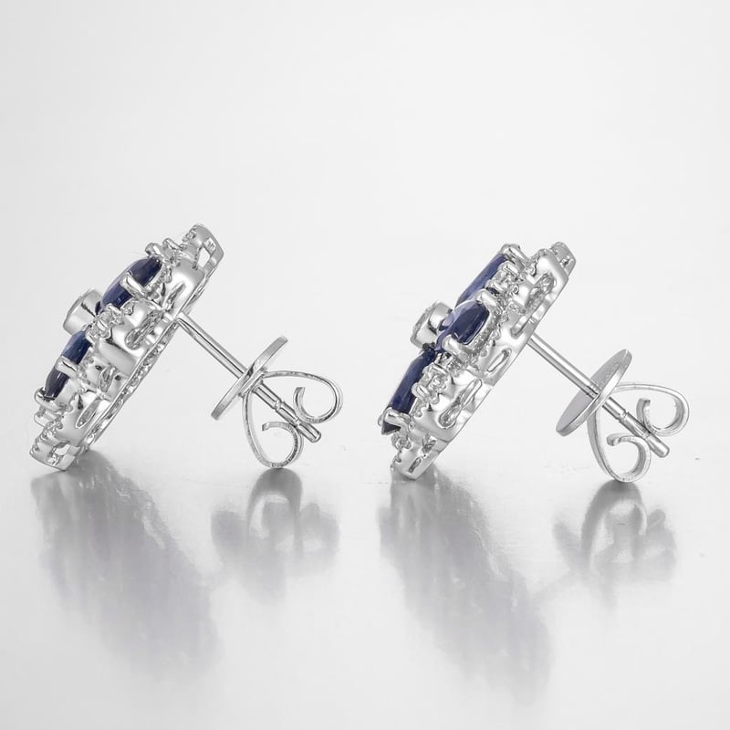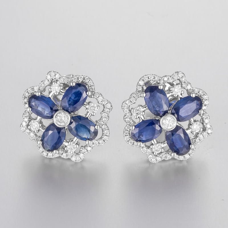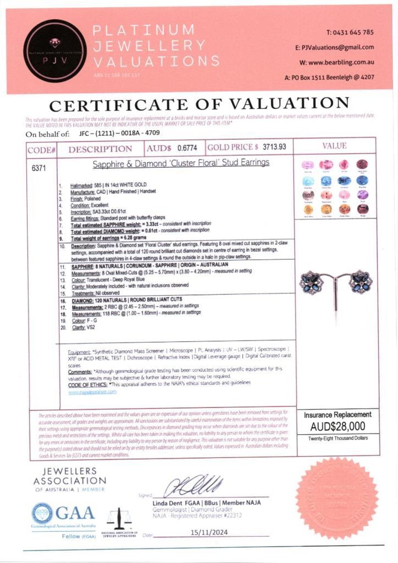 14CT WHITE GOLD AUSTRALIAN SAPPHIRE AND DIAMOND FLORAL STUD EARRINGS FEATURING CENTRE, 8 OVAL CUT, DEEP ROYAL BLUE AUSTRALIAN SAPPHIRES (3.33CT TSW, MODERATELY INCLUDED), CLAW SET, WITH 120 ROUND BRILLIANT CUT DIAMONDS (0.61CT TDW, F-G COLOUR, VS2 CLARITY), BEAD SET.