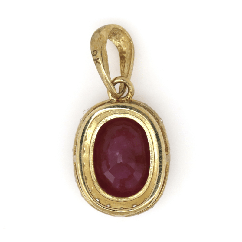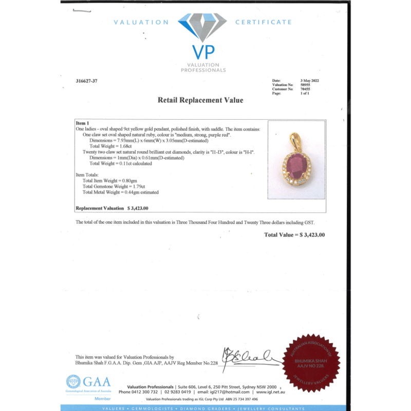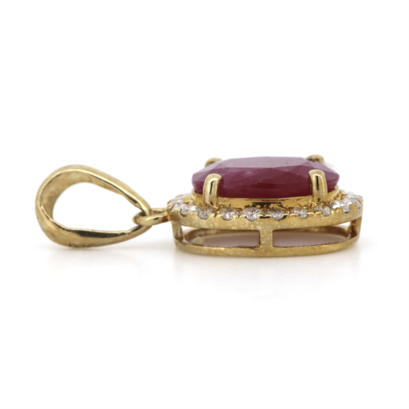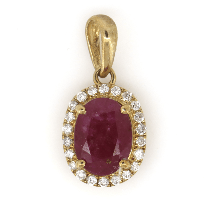 9K YELLOW GOLD, RUBY AND DIAMOND, HALO PENDANT. THE CENTRE FEATURES, ONE ROUND FACETED CUT, MEDIUM STRONG PURPLISH-RED, RUBY (1.68CT, INCLUDED), CLAW SET. SURROUNDING THE CENTRE IN A HALO ARE, 22 ROUND BRILLIANT CUT, DIAMONDS (0.11CT TDW, G-H COLOUR, I1-I3 CLARITY), CLAW SET.