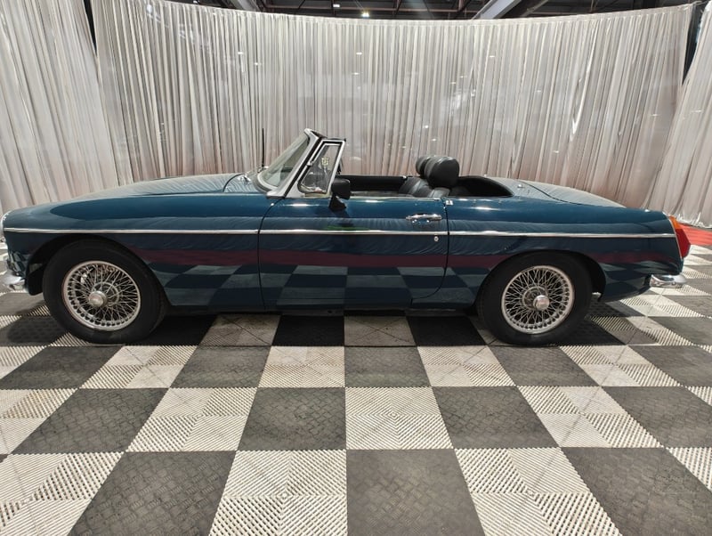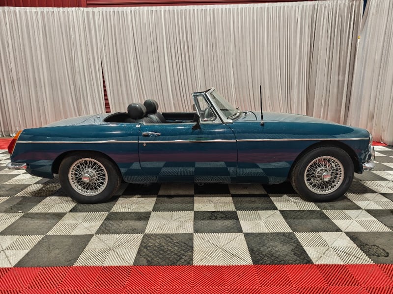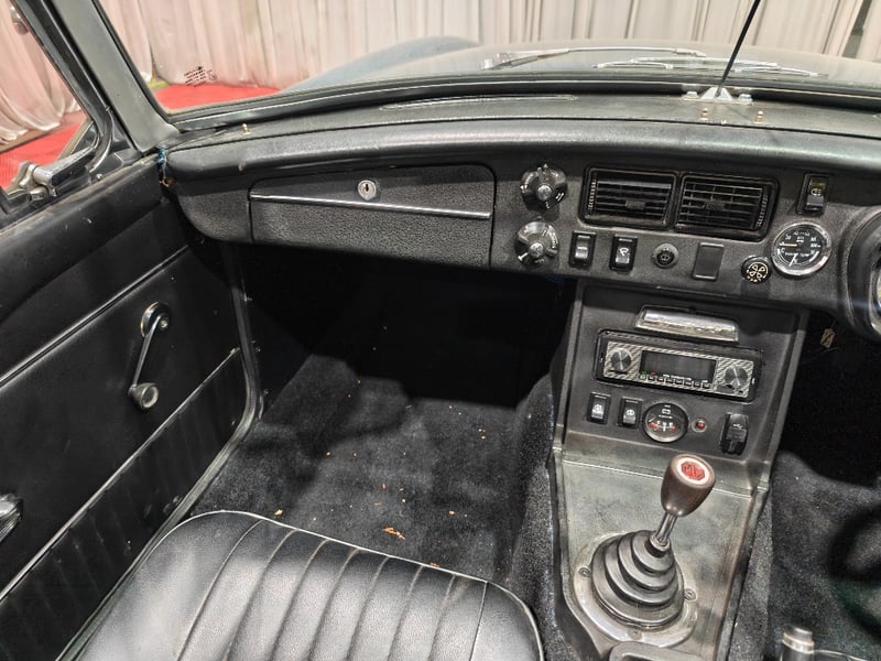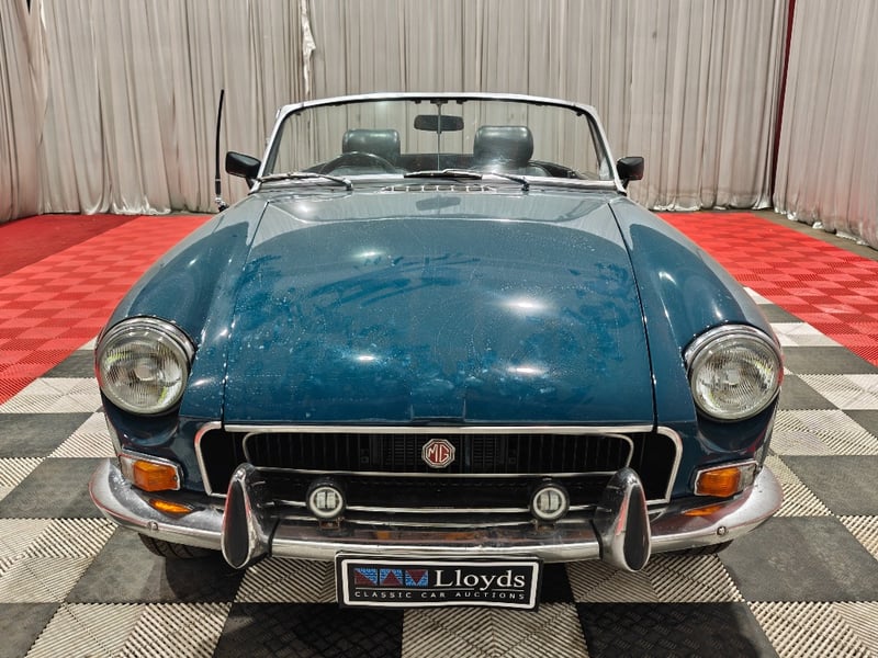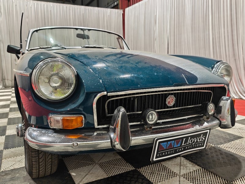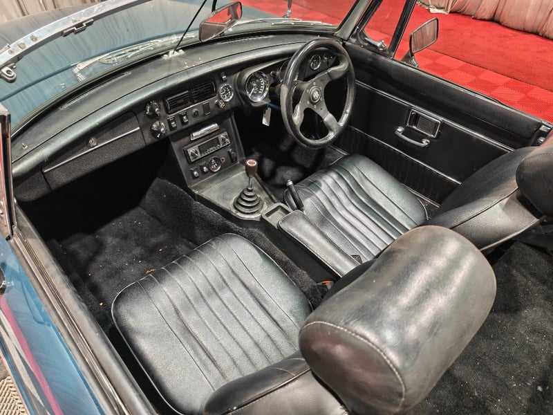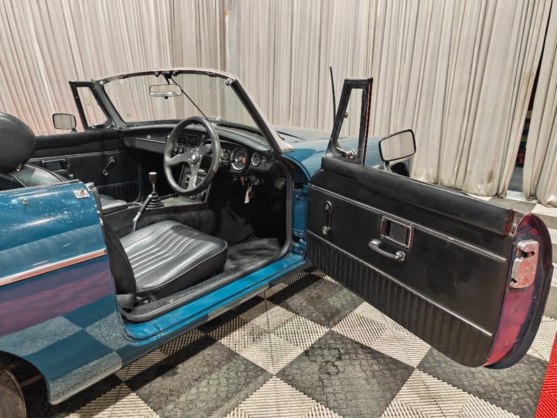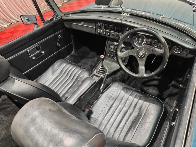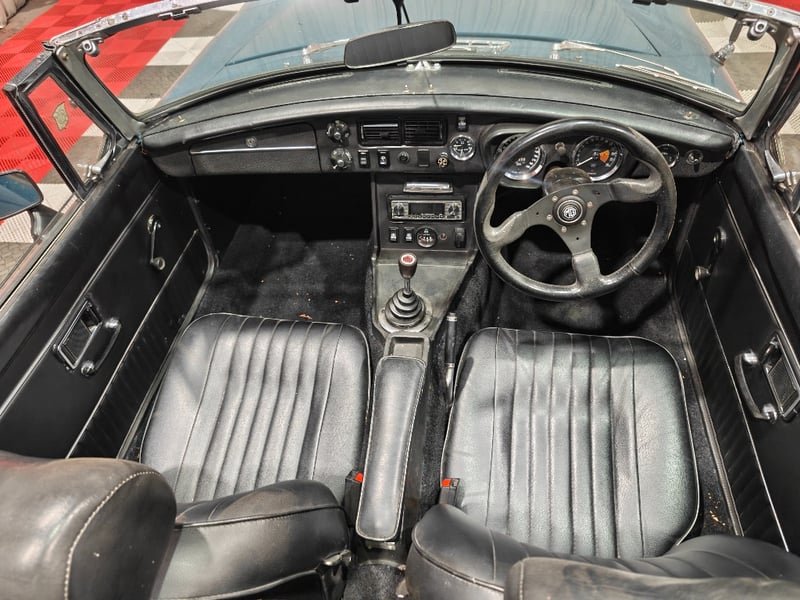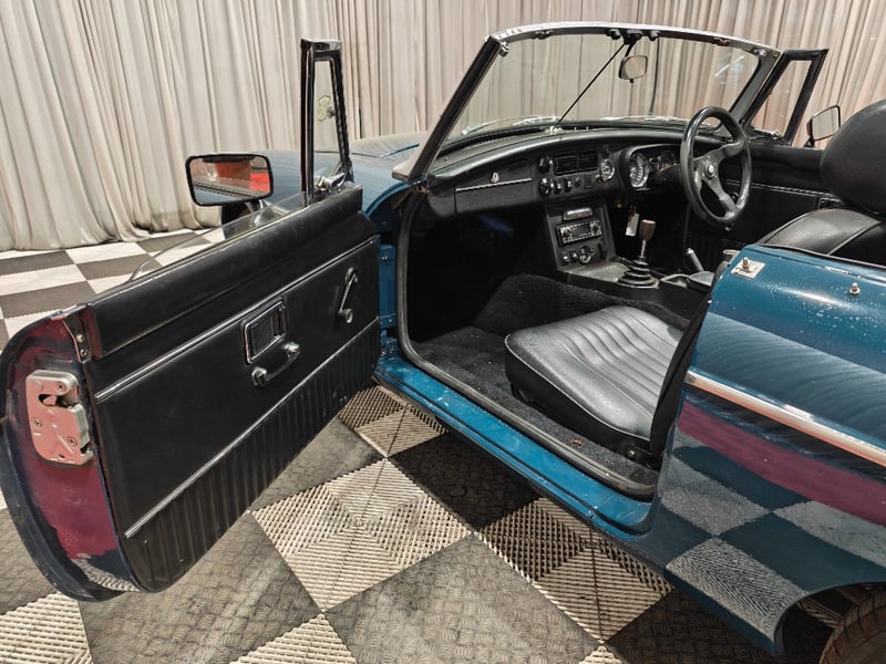 1969 MG B MKII two‑door convertible finished in Blue. Rear‑wheel drive configuration powered by a four‑cylinder petrol engine paired with a manual transmission. Odometer indicating 79,589 miles. Seating for two occupants.