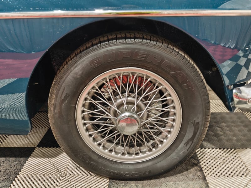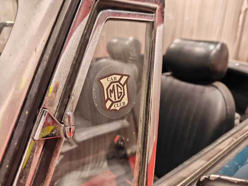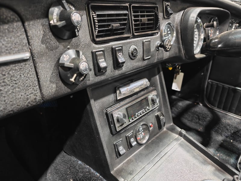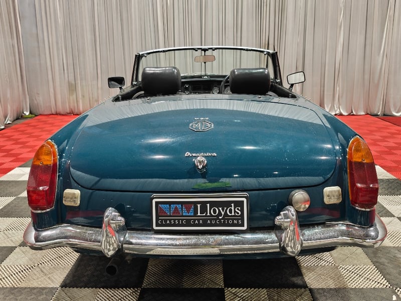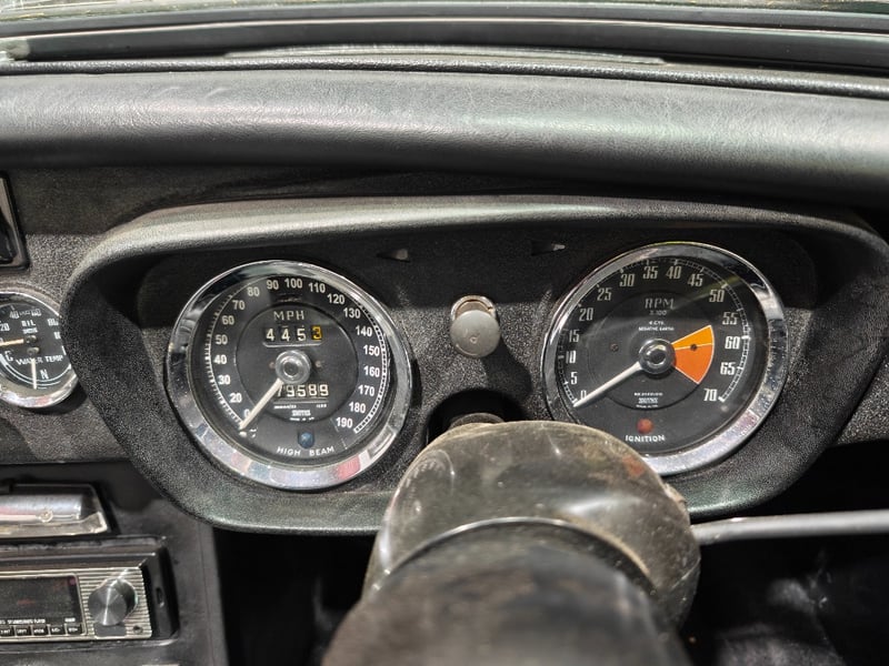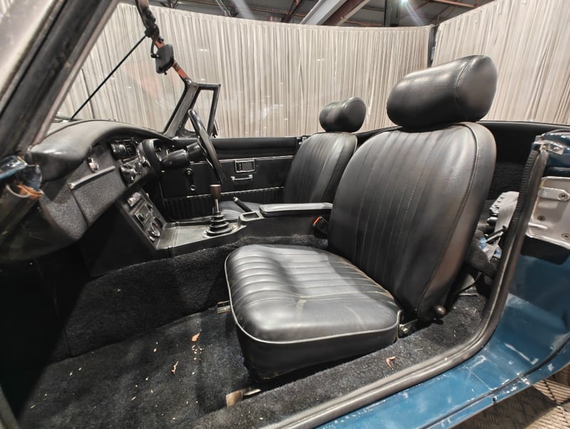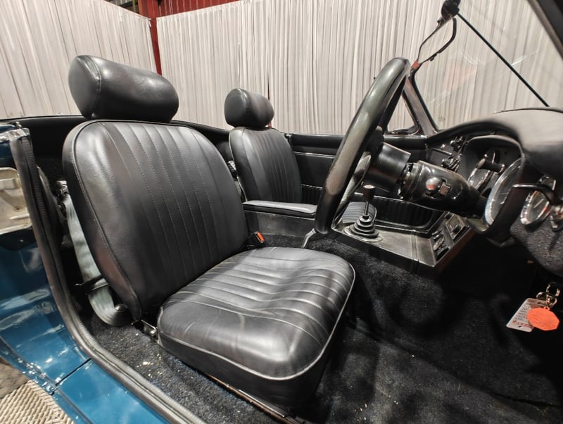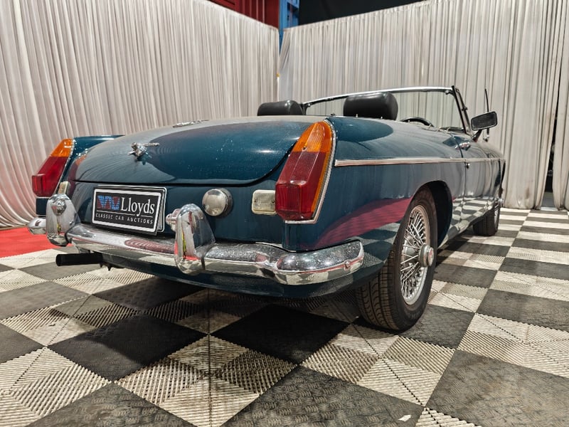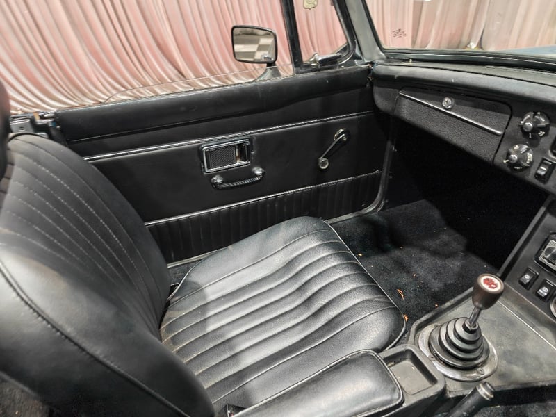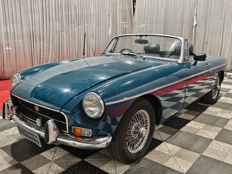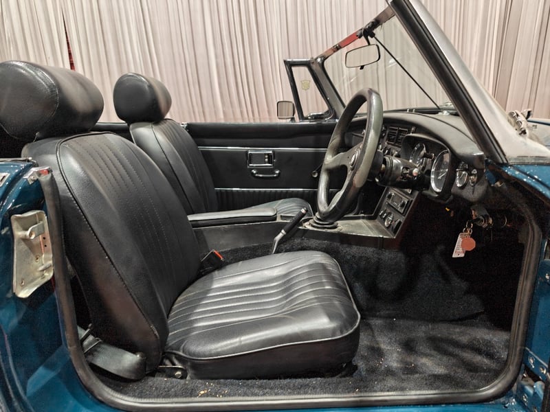 1969 MG B MKII two‑door convertible finished in Blue. Rear‑wheel drive configuration powered by a four‑cylinder petrol engine paired with a manual transmission. Odometer indicating 79,589 miles. Seating for two occupants.